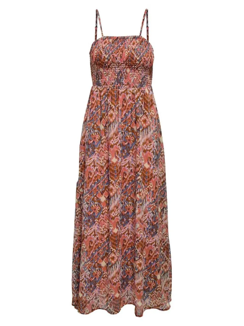 Lang kjole fra Only i orange nuancer med mønster. Kjolen har en smocked overdel med broderi og dekorative syninger, der giver den et håndlavet præg. Den løse pasform og de tynde stropper skaber en let silhuet.