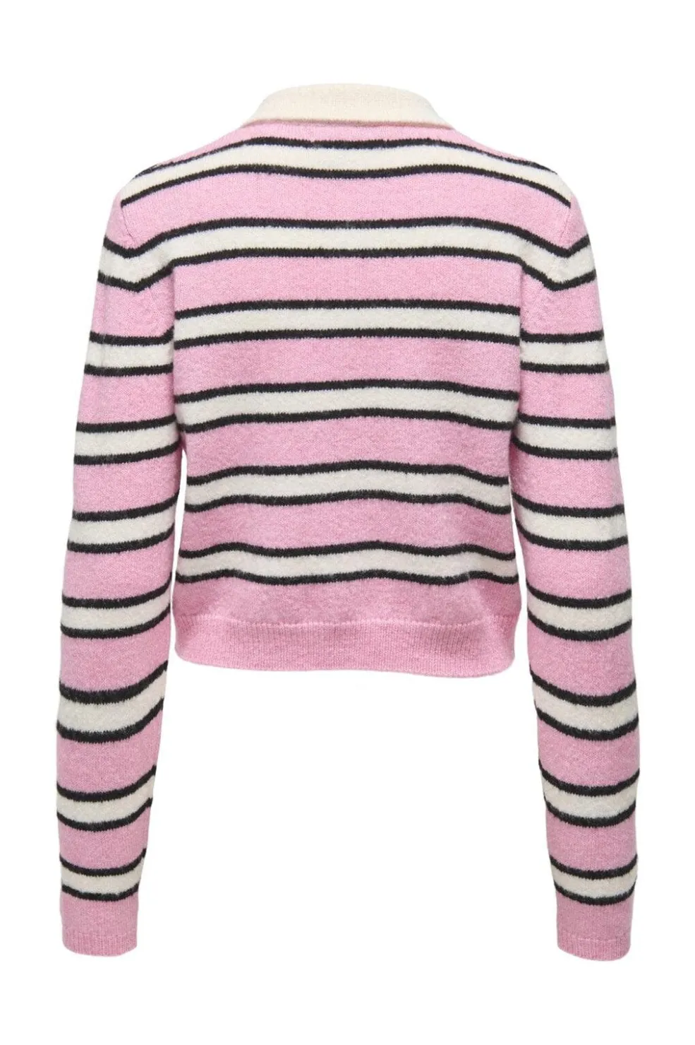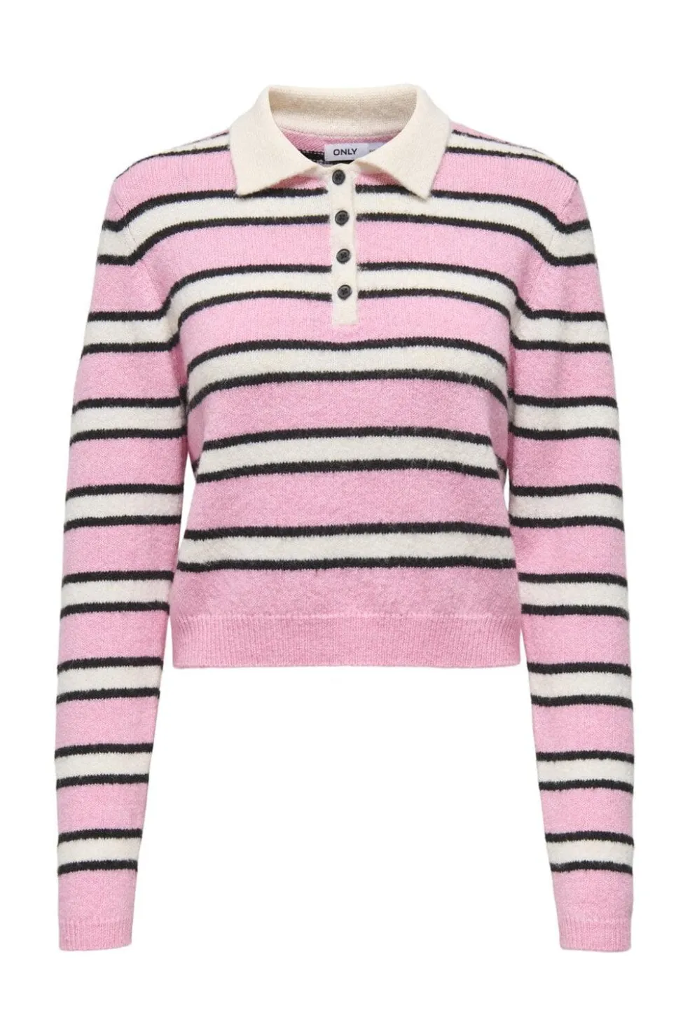 Stribet strikpullover fra Only med polokrave. Den har et mønster i pink, sort og hvid med sorte knapper foran.