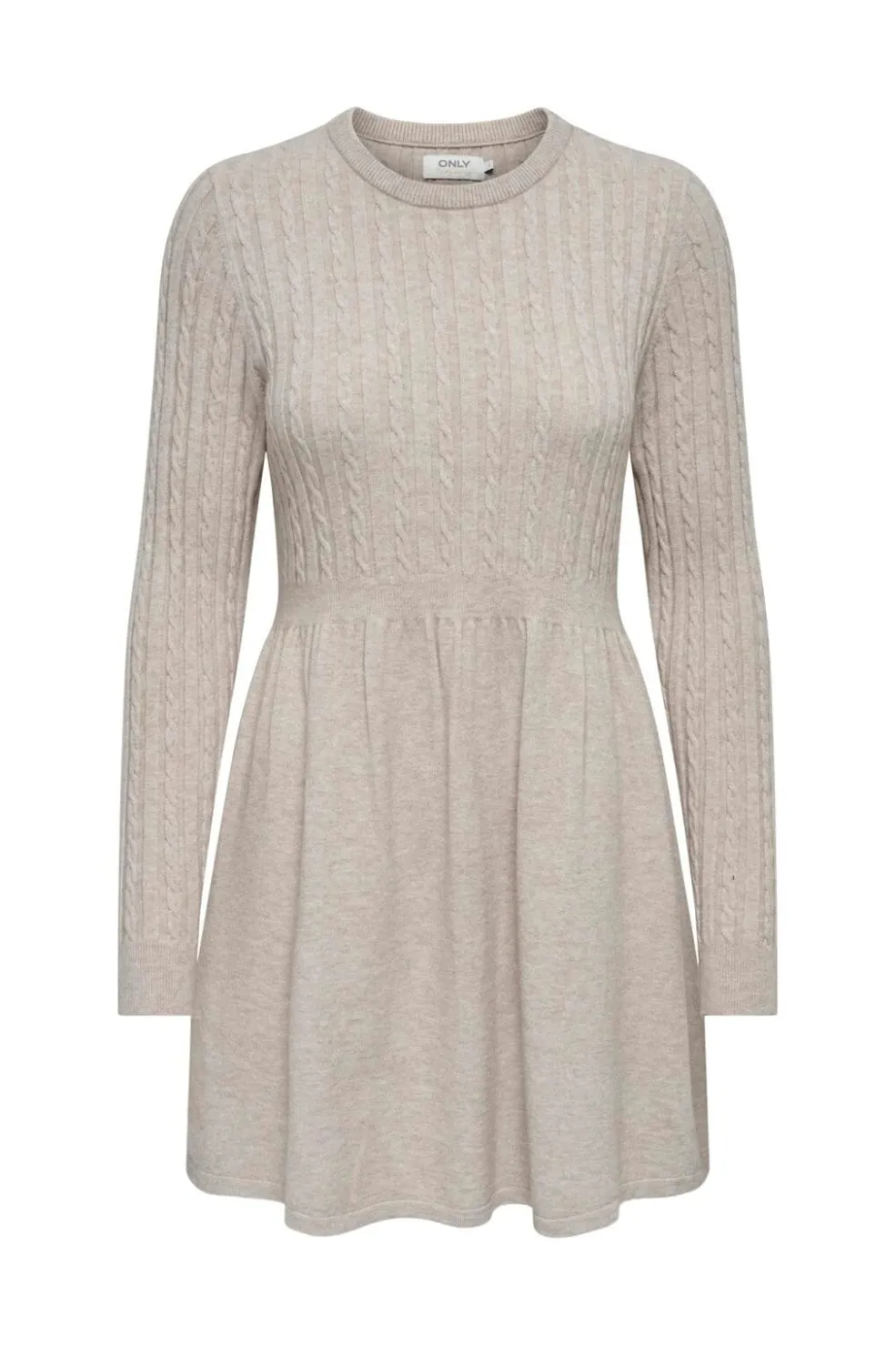 Strikket kjole fra Only i grå og beige melange nuancer. Kjolen har kabelstrik på overdelen og ærmerne samt en rund halsudskæring.