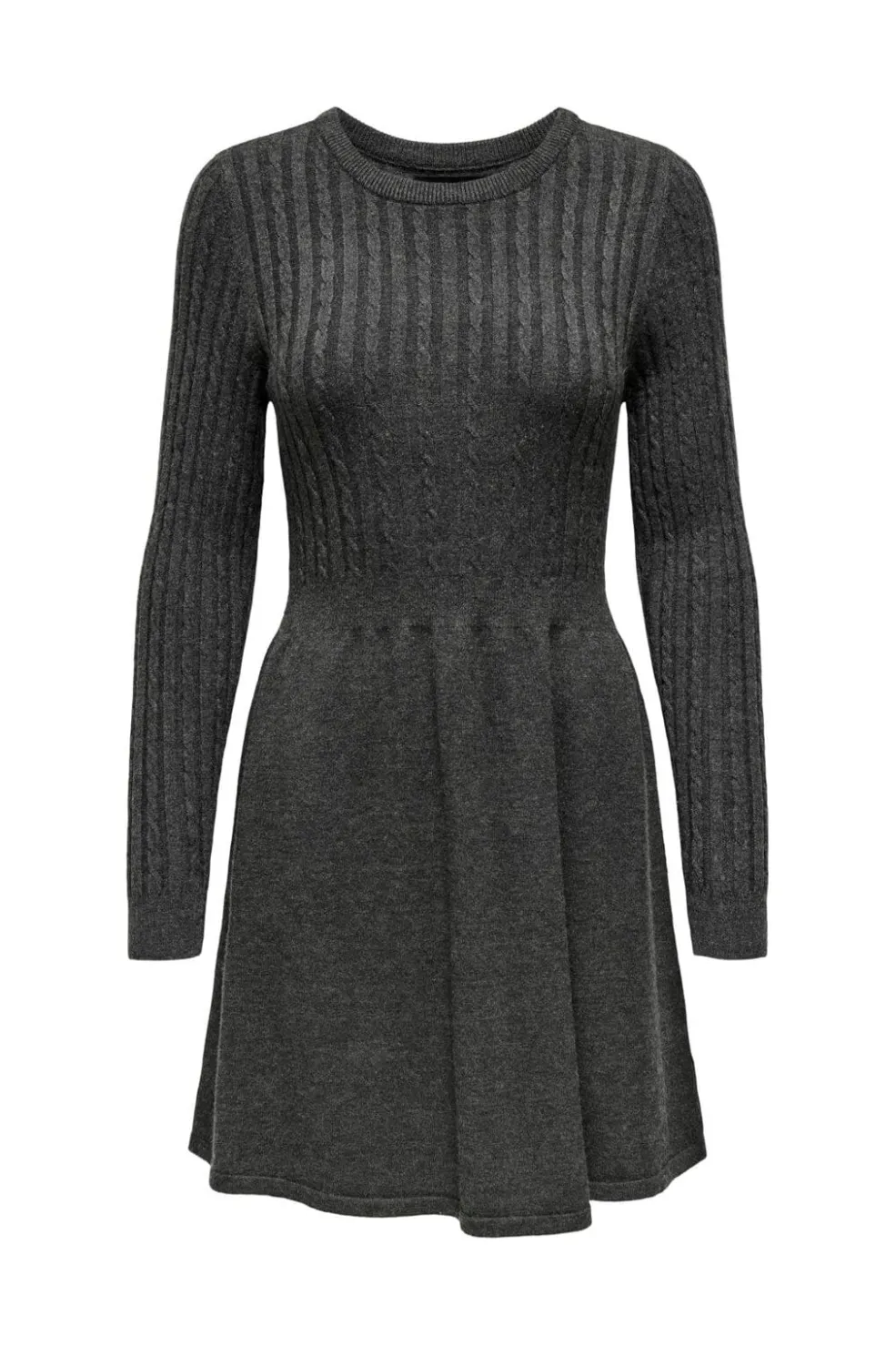Mørkegrå strikkjole fra Only med kabelstrik. Kjolen har en rund hals og lange ærmer i en regular fit-pasform, der giver god bevægelsesfrihed.