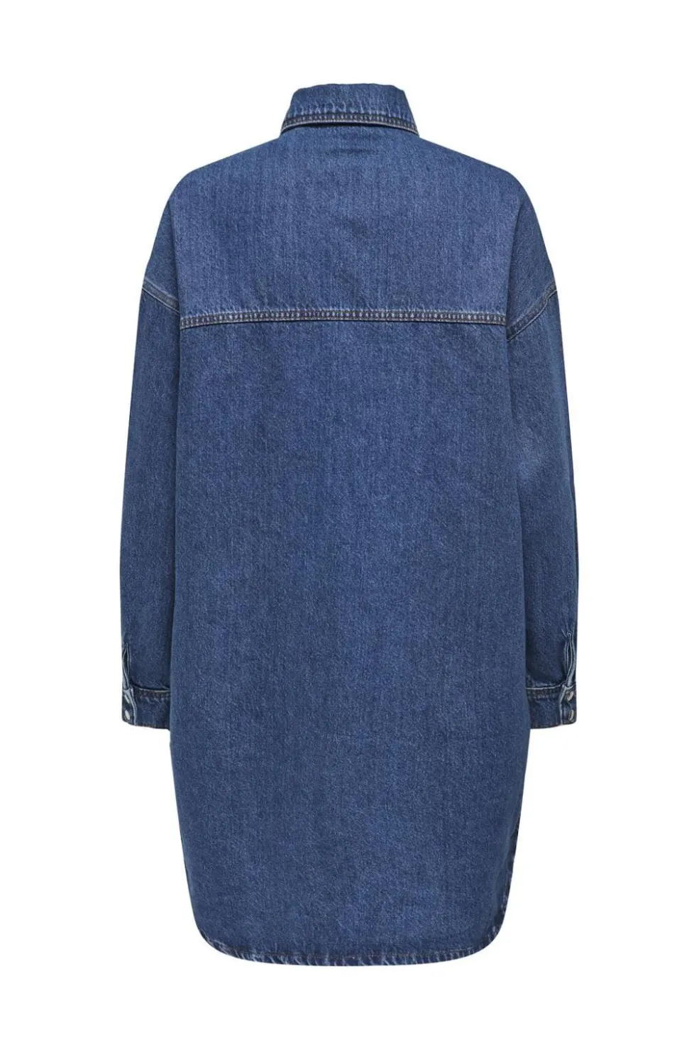 Denimkjole fra Only i medium blå denim. Kjolen har en skjortekrave, knaplukning foran og to brystlommer. Den oversized pasform giver en afslappet stil.