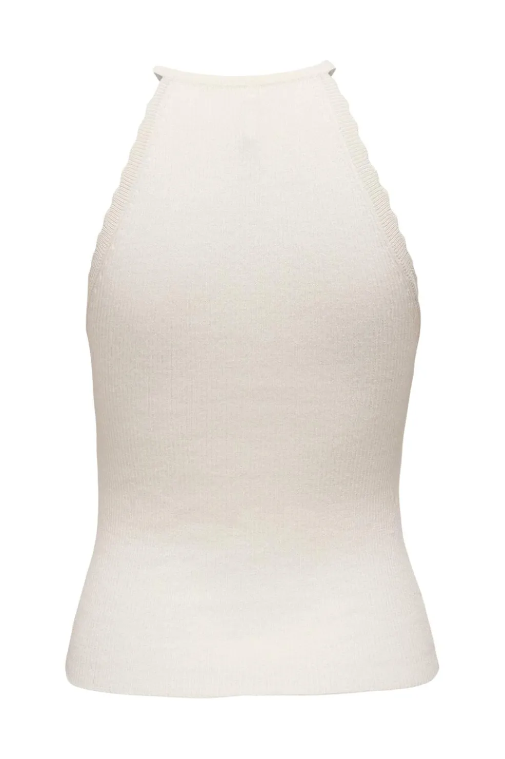 Strikket top fra Only i cremehvid Cloud Dancer-farve. Toppen har en ribbet tekstur og et halterneck-design med bølgede kanter. Den ærmeløse model har en lige pasform.