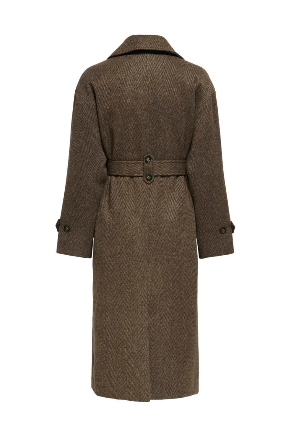 Brun frakke fra Only med sildebensmønster. Fremstillet af vævede materialer med revers halsudskæring, knapper foran og bælte i taljen. Ærmerne har justerbare kanter med knapper.