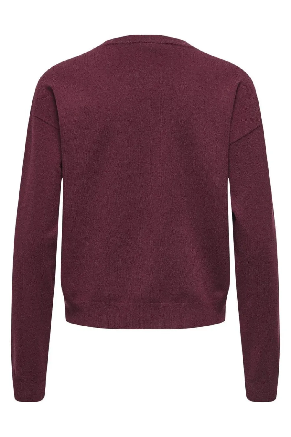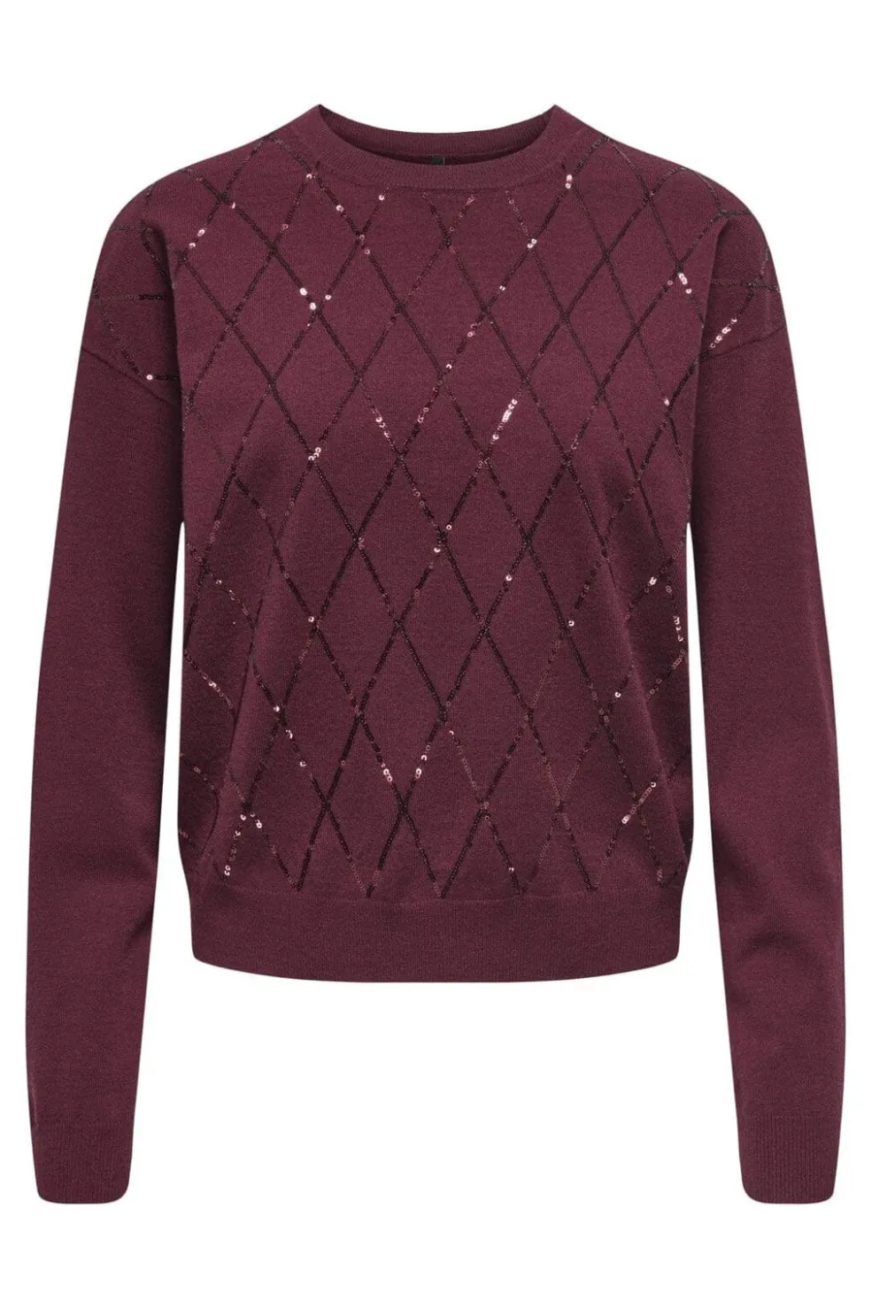 Striktrøje fra Only i dyb rød burgunderfarve. Fronten har et diamantmønster dekoreret med pailletter, og trøjen har en rund halsudskæring.