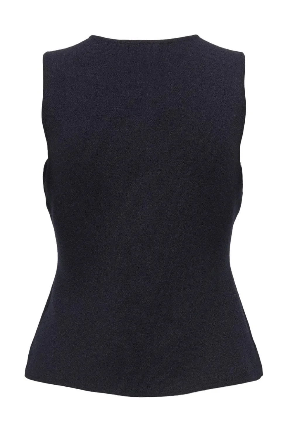 Mørkeblå vest fra Only med sølvfarvede knapper. Den har en O-hals og et ærmeløst design med regular fit.