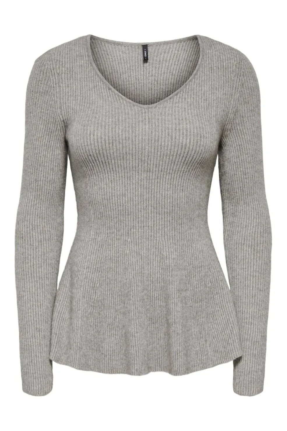 Grå striktrøje fra Only med V-hals og et peplum-lignende design forneden. Trøjen er en pullover uden lukning.