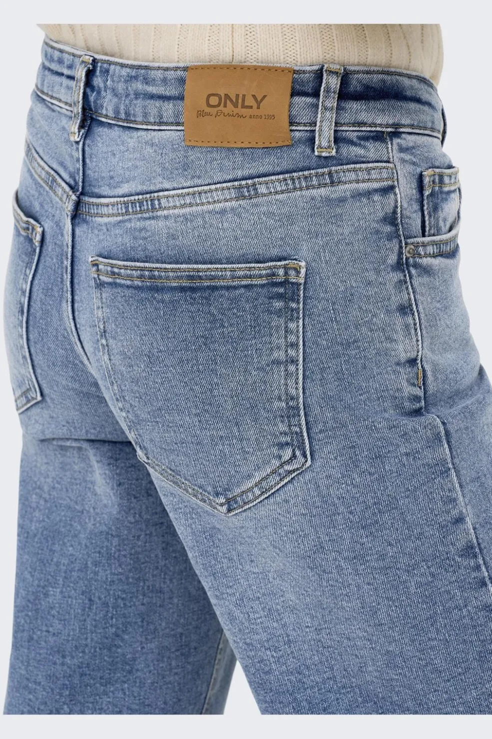Lyseblå vidde-ben jeans fra Only i et løst fit. Jeansene har lav talje med bæltestropper og forlommer. Lukningen er med knapper i gylpen.