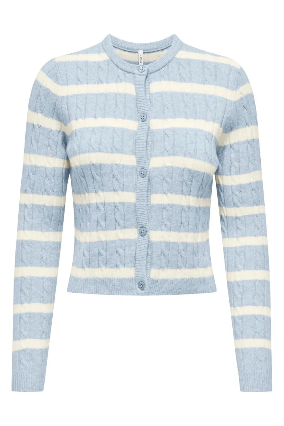 Strikket cardigan fra Only i lyseblå med hvide striber. Cardiganen har kabeldetaljer og knaplukning foran med matchende knapper.