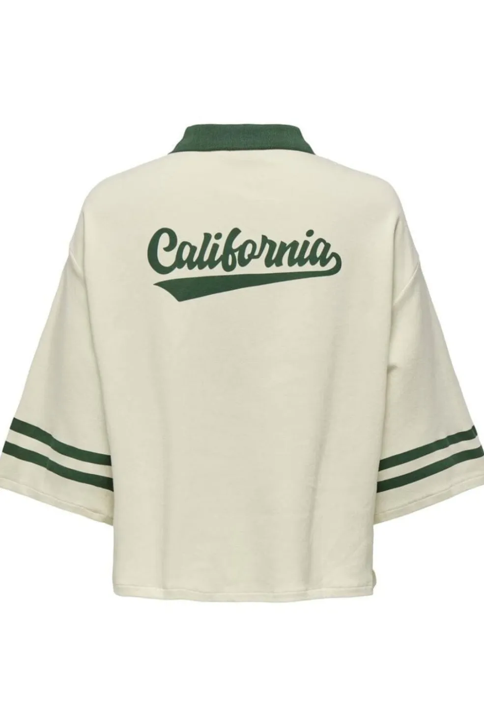 Oversized polo fra Only i lys beige med grønne detaljer. Den har broderet tekst på forsiden med Travel to Paradise og Endless Adventure, mens bagsiden har et California-print.
