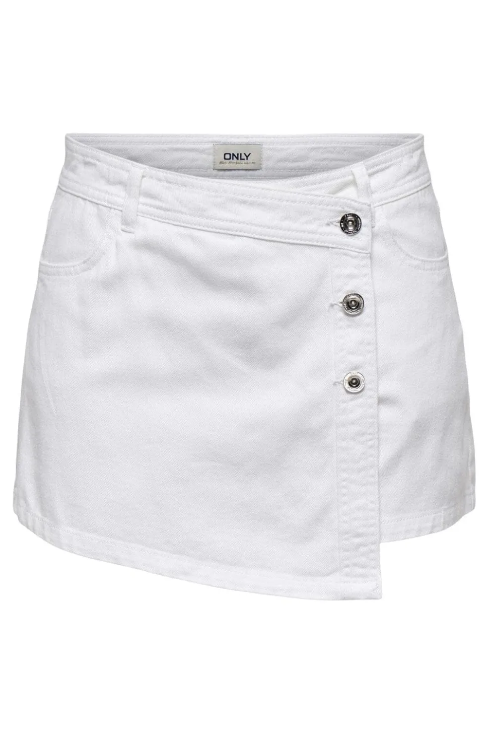 Hvid denim skort fra Only med omslagsdesign. Skorten har en slim fit-pasform med mellemhøj talje og tre knapper i siden. Praktiske lommer foran og bag gør den funktionel til hverdagsbrug.