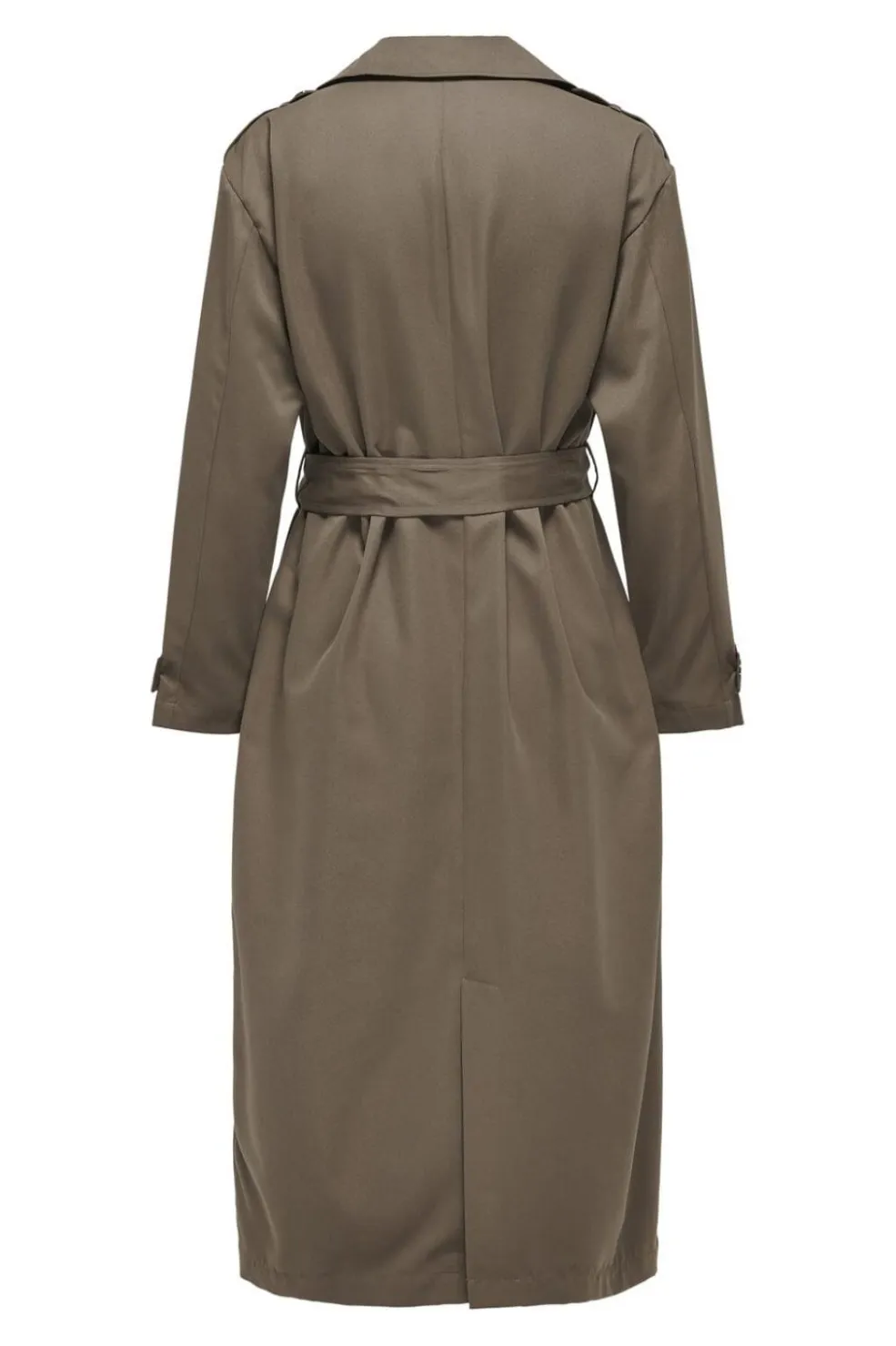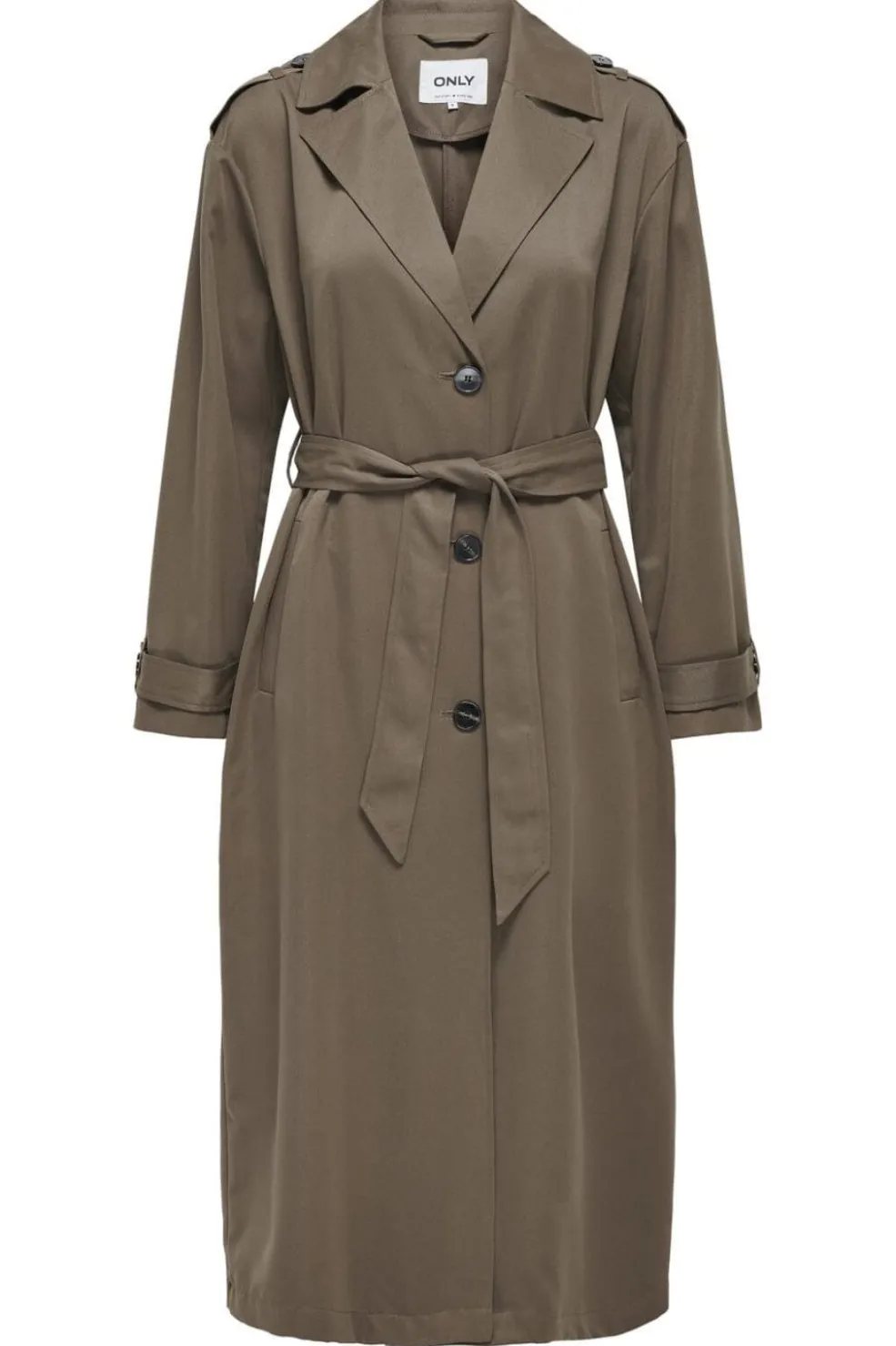 Lang trenchcoat fra Only i valnøddebrun. Den har klassisk revers ved halsen og lukkes med knapper. Bæltet i taljen kan justeres efter behov.