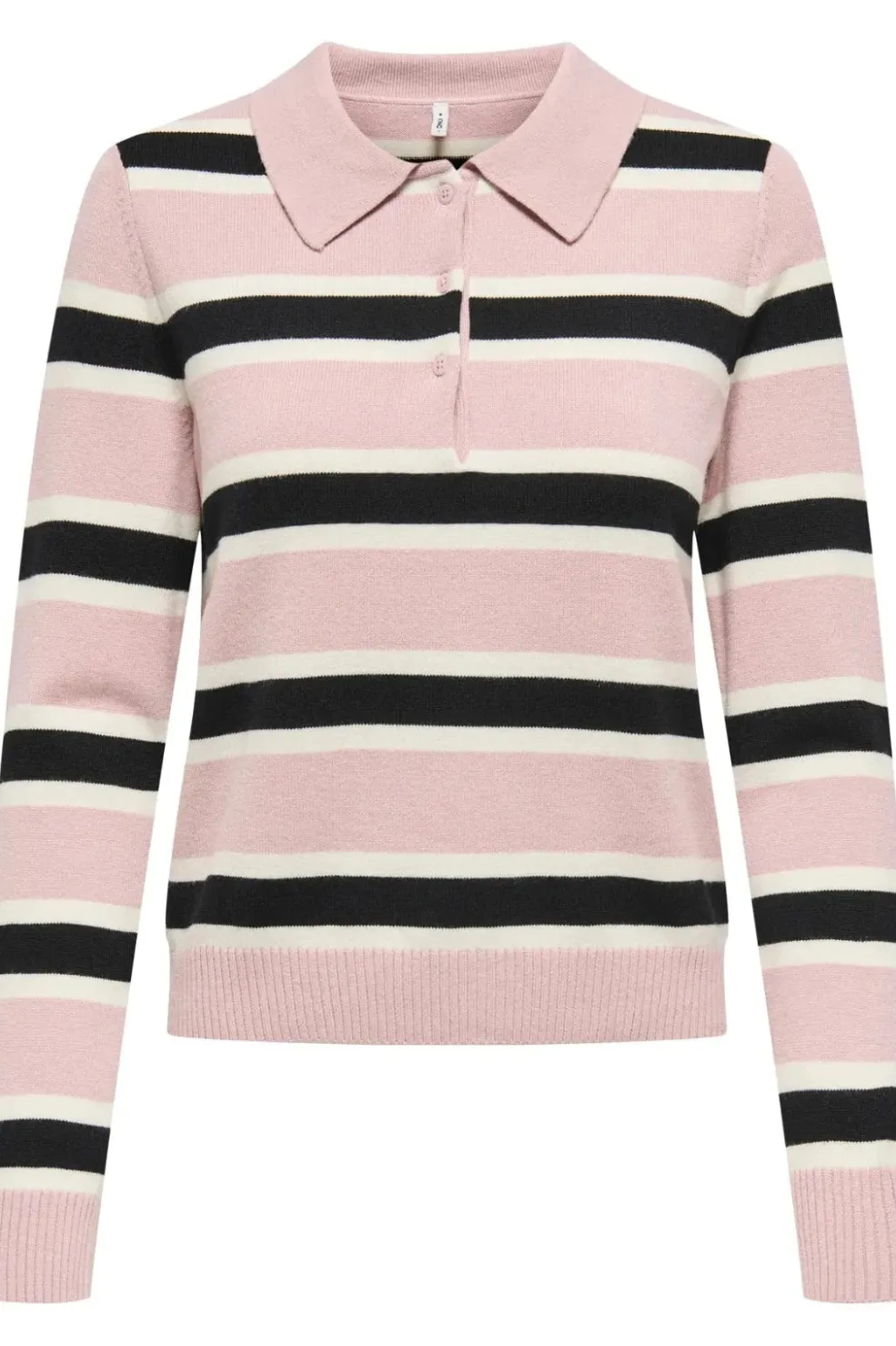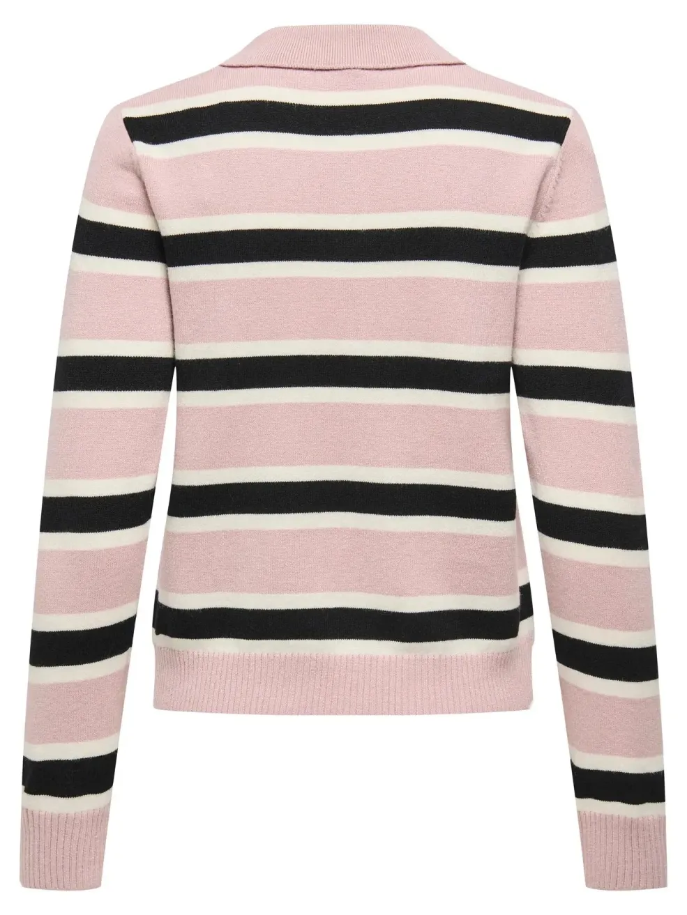 Stribet polostrik fra Only i lyserød lilla med sorte og hvide striber. Strikken har en polohals og lange ærmer.