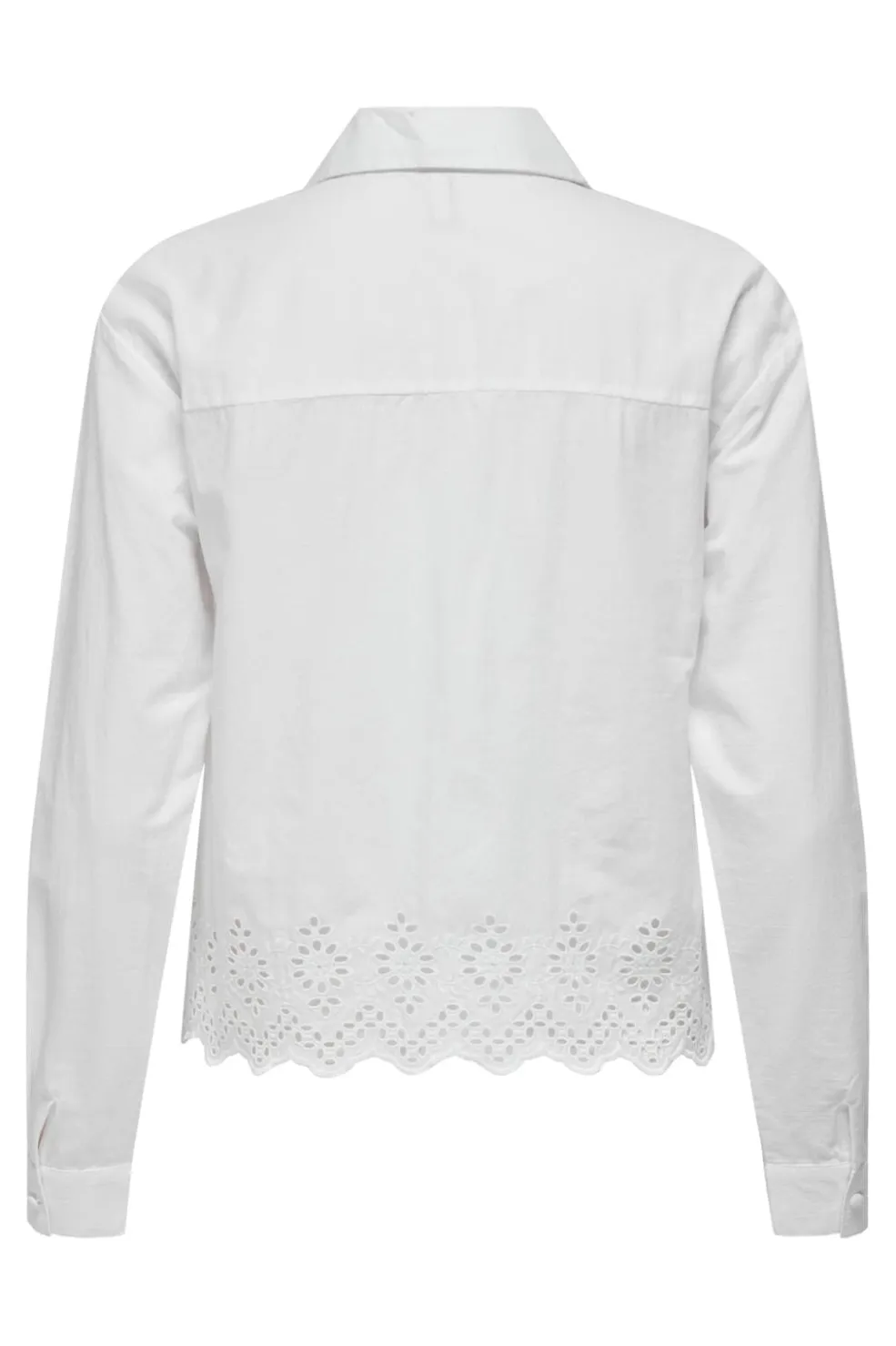 Hvid skjorte fra Only med broderie anglaise-detaljer langs kanten. Skjorten har lange ærmer og en klassisk skjortekrave med knaplukning foran.
