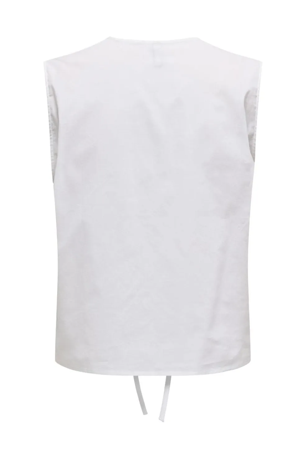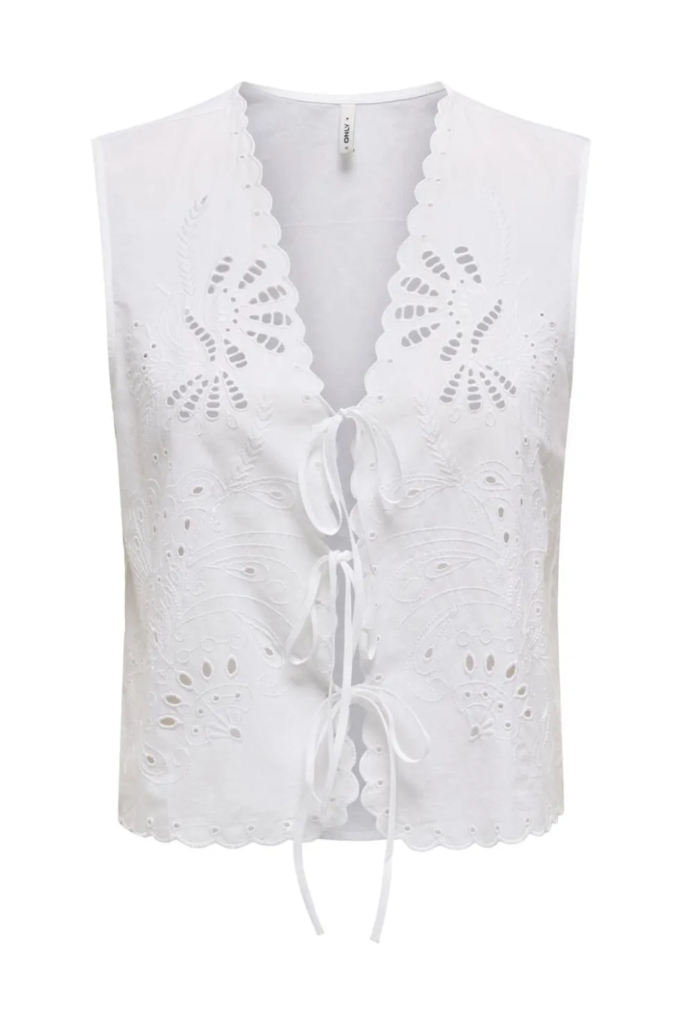 Hvid vest fra Only med broderede blomstermønstre. Vesten har en rund hals, snørelukning foran og en cropped længde. Broderiet har et anglaise-mønster med fine detaljer.