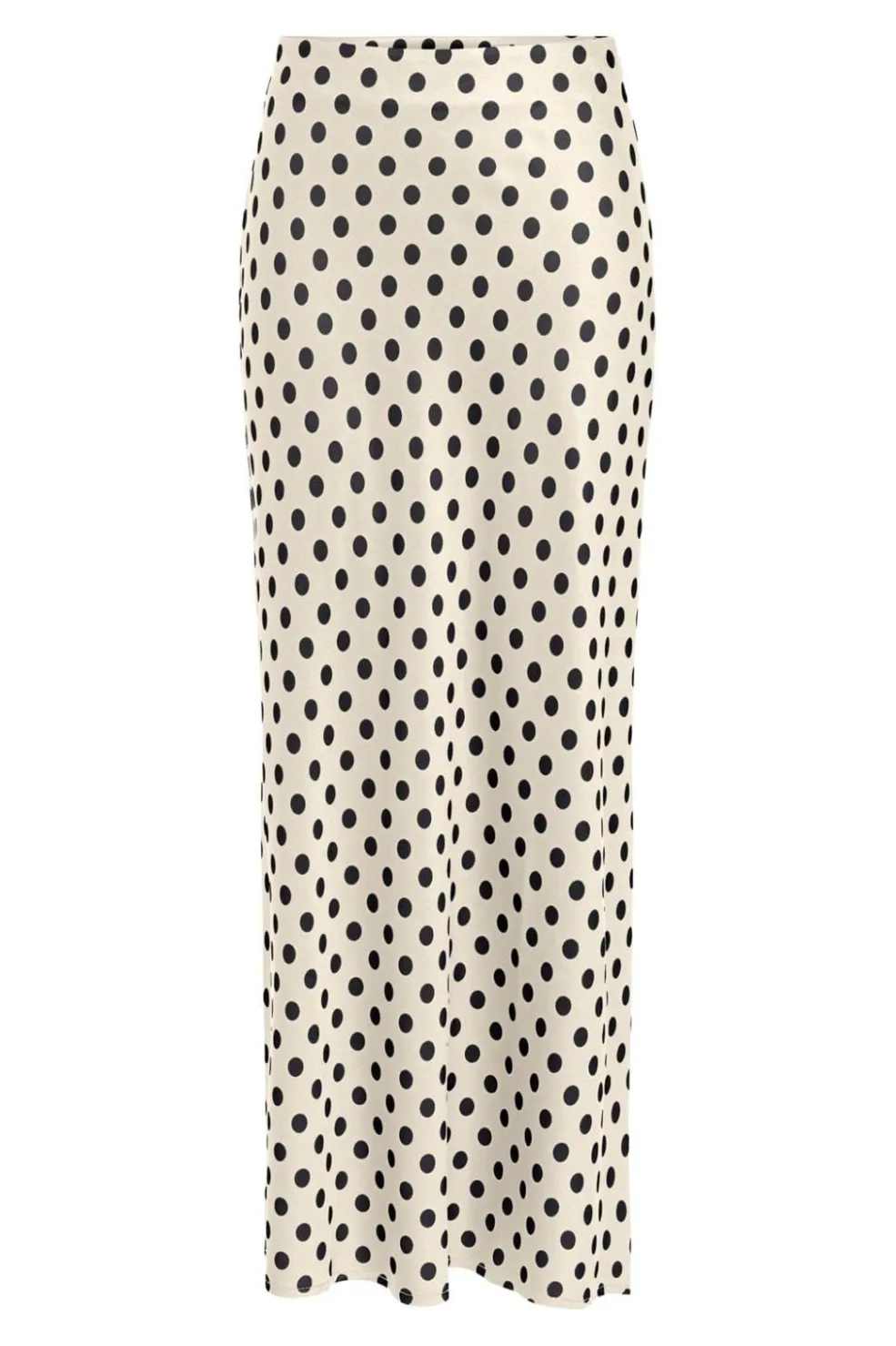 Lang satinnederdel fra Only i en lys beige nuance med sorte prikker. Nederdelen har et klassisk polka dot-mønster og en blød, glat overflade.
