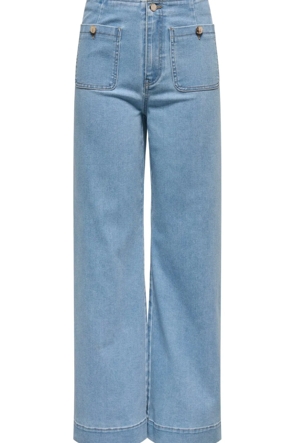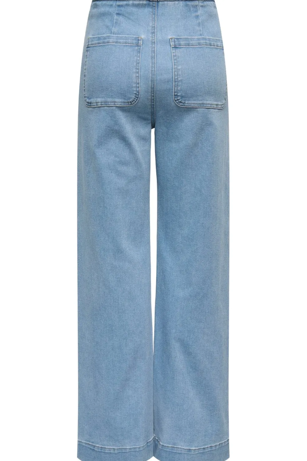 Lyseblå jeans fra Only med høj talje og vide ben. Jeansene har store lommer foran og bæltestropper i taljen. Designet med ankellængde og loose fit.