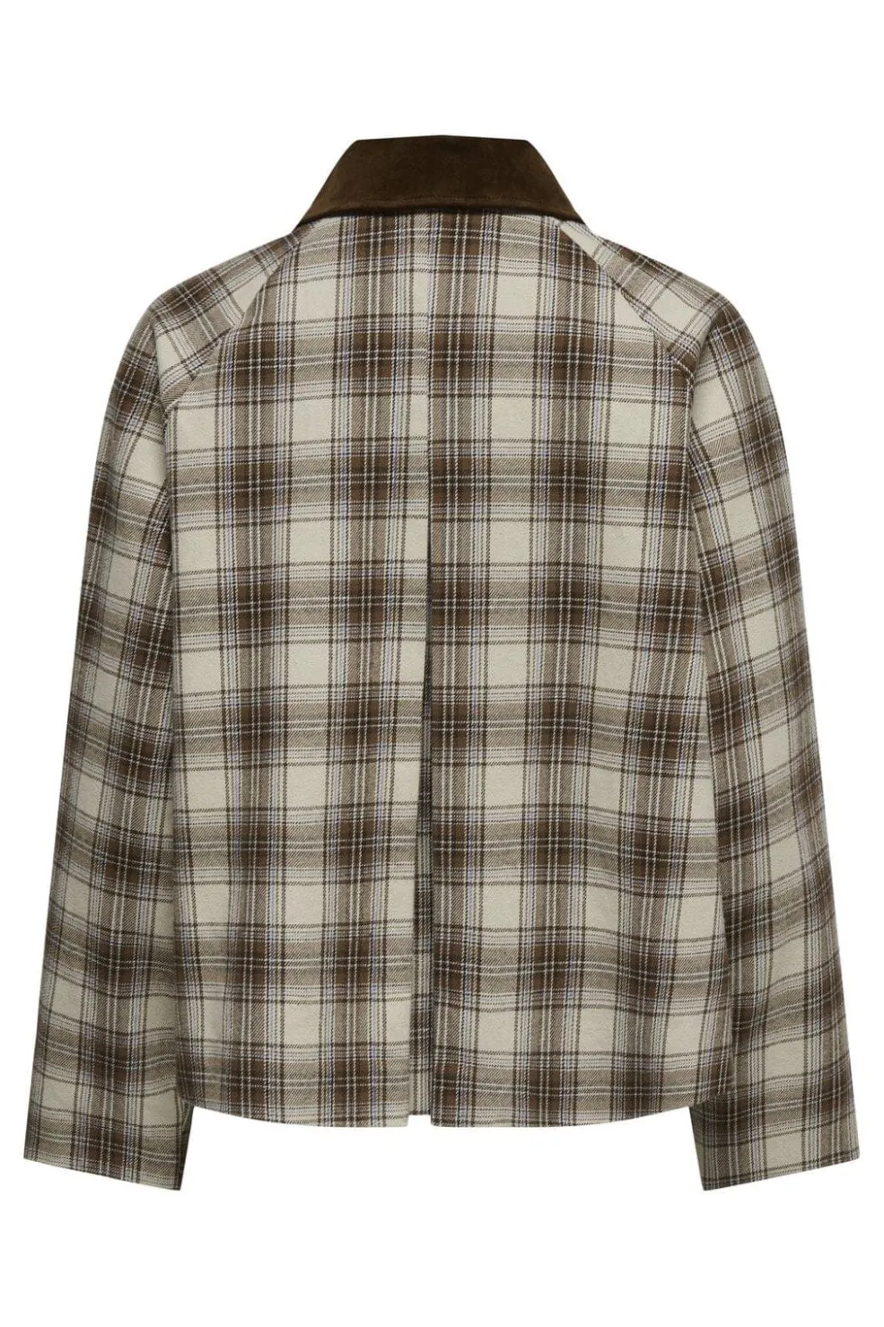 Ternet jakke fra Only med et klassisk mønster i creme- og brune nuancer. Jakken har en mørk baseballkrave og praktiske sidelommer, der gør den brugbar til mange anledninger.