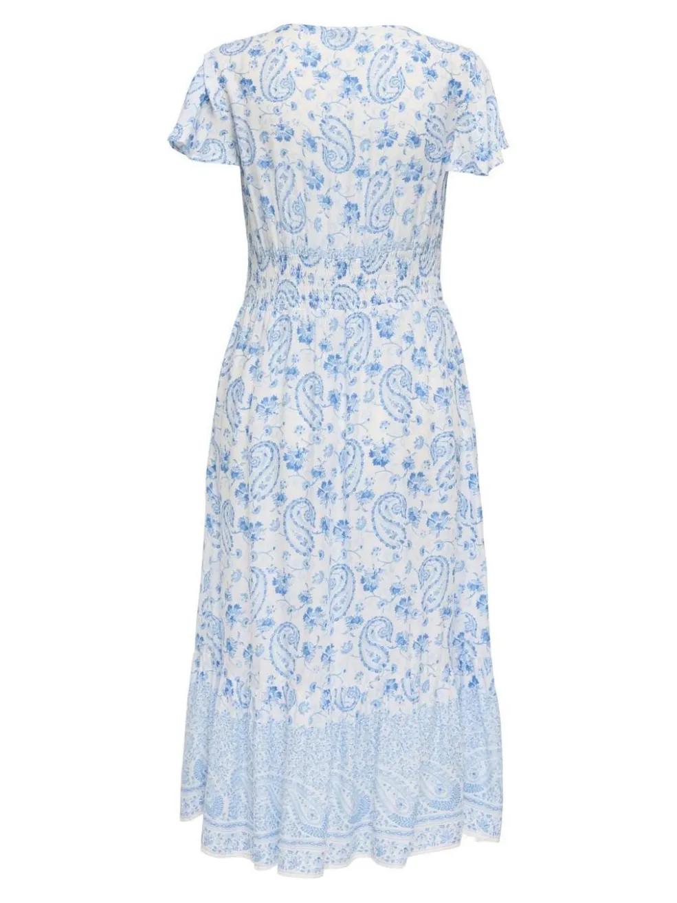 Midi-kjole fra Only med blå og hvidt paisley-mønster. Kjolen har V-hals med knapper og korte ærmer. Den smockede talje og flæsekanten giver kjolen et let og sommerligt præg.
