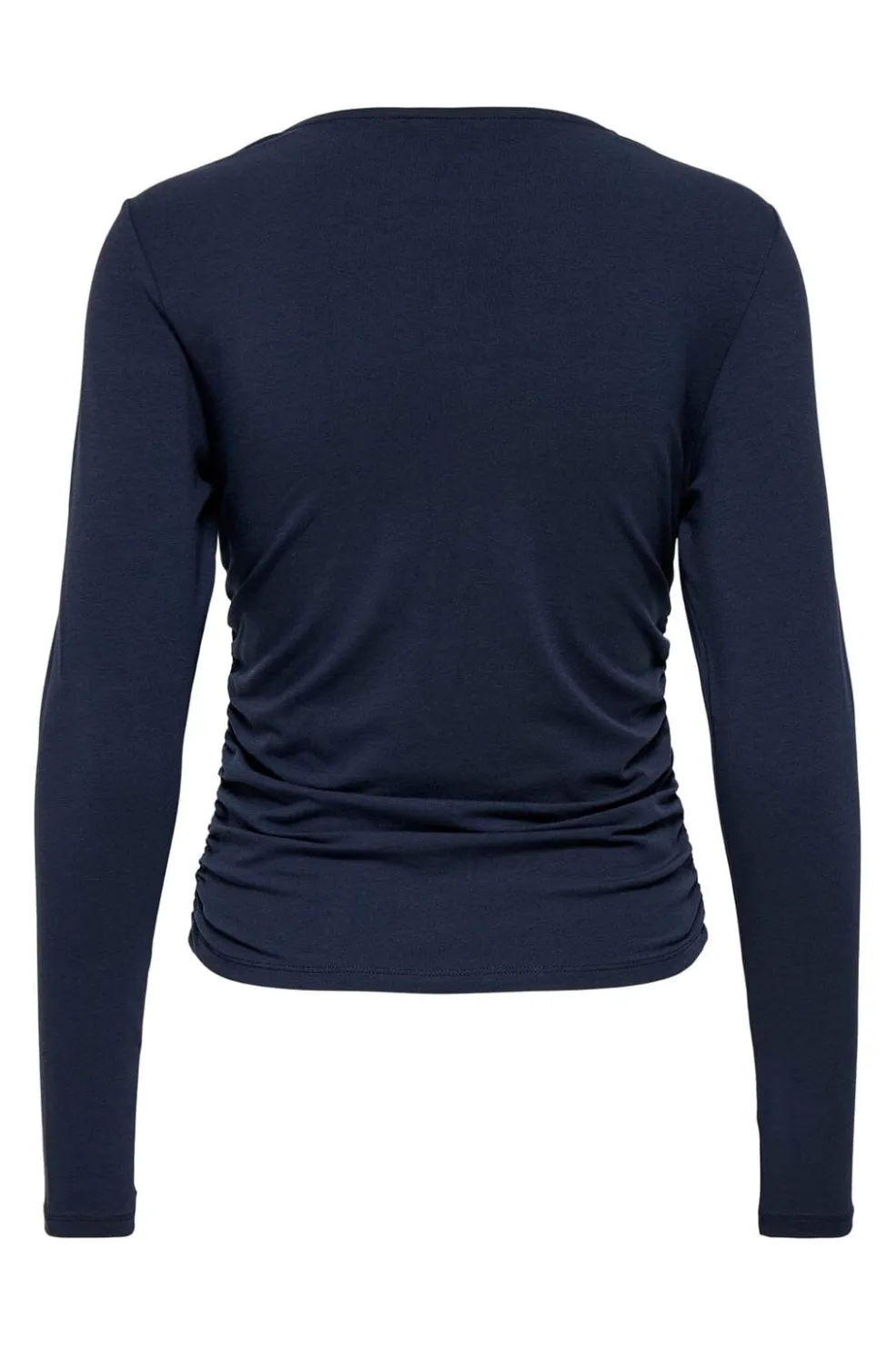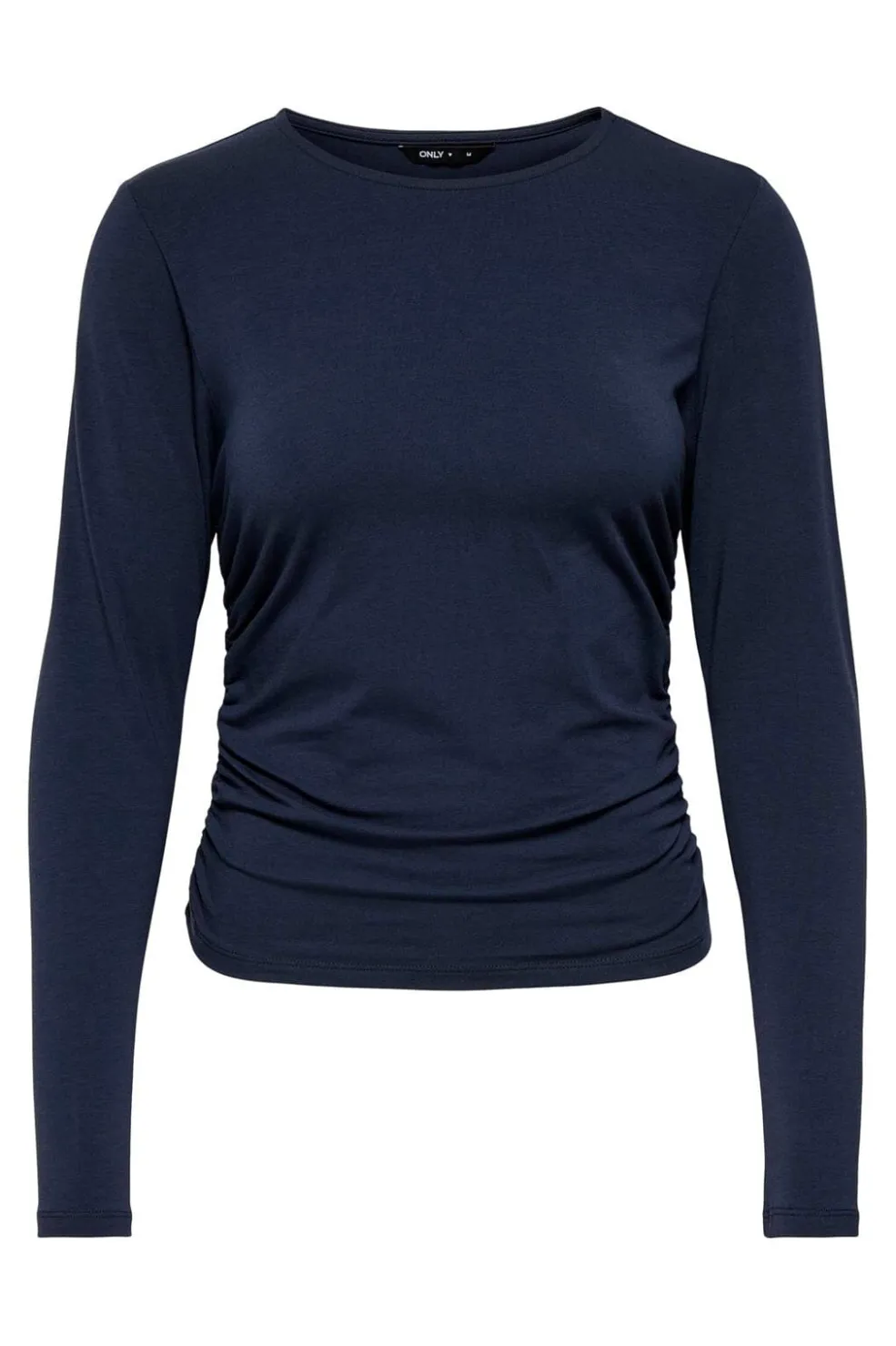 Mørkeblå langærmet top fra Only, lavet af økologisk bomuld. Toppen har rynkedetaljer på siderne og en rund hals.