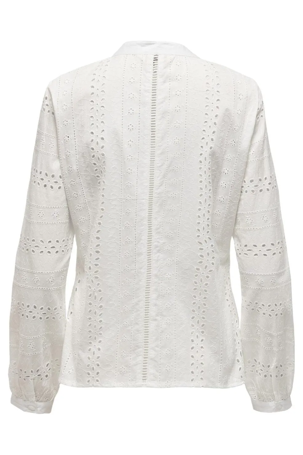 Hvid bluse fra Only med broderie anglaise-mønster. Blusen har en skjortekrave med knaplukning og lange ærmer med manchetter.