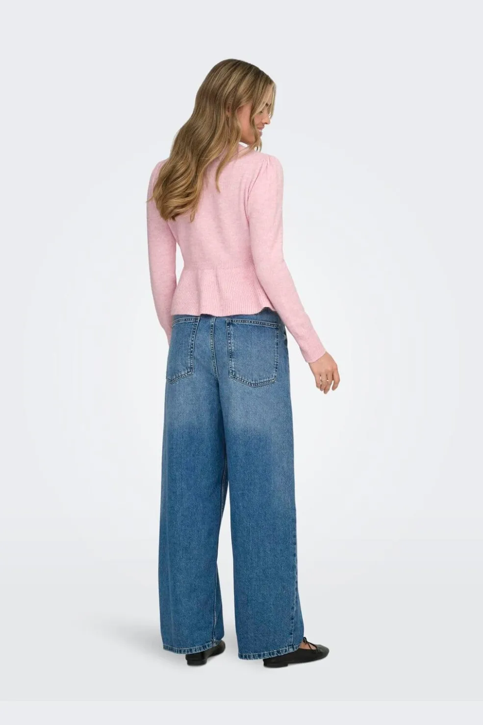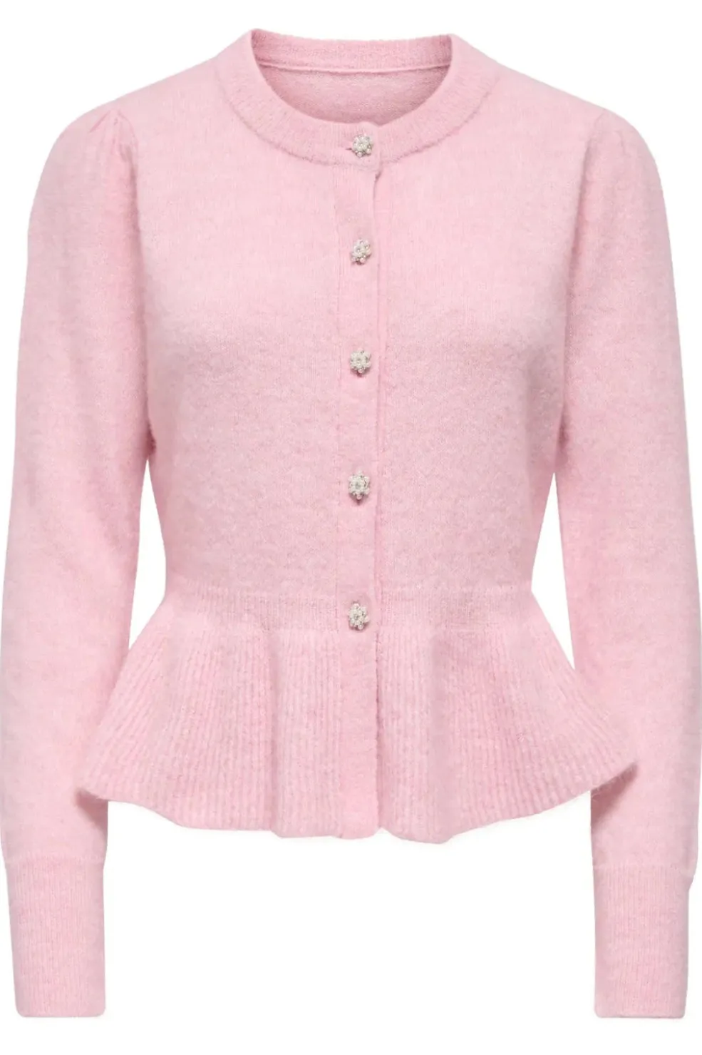 Lyserød cardigan fra Only i en rosa melange-nuance. Cardiganen har perleknapper, en peplumdetalje og ribkanter, der giver den et feminint udtryk.