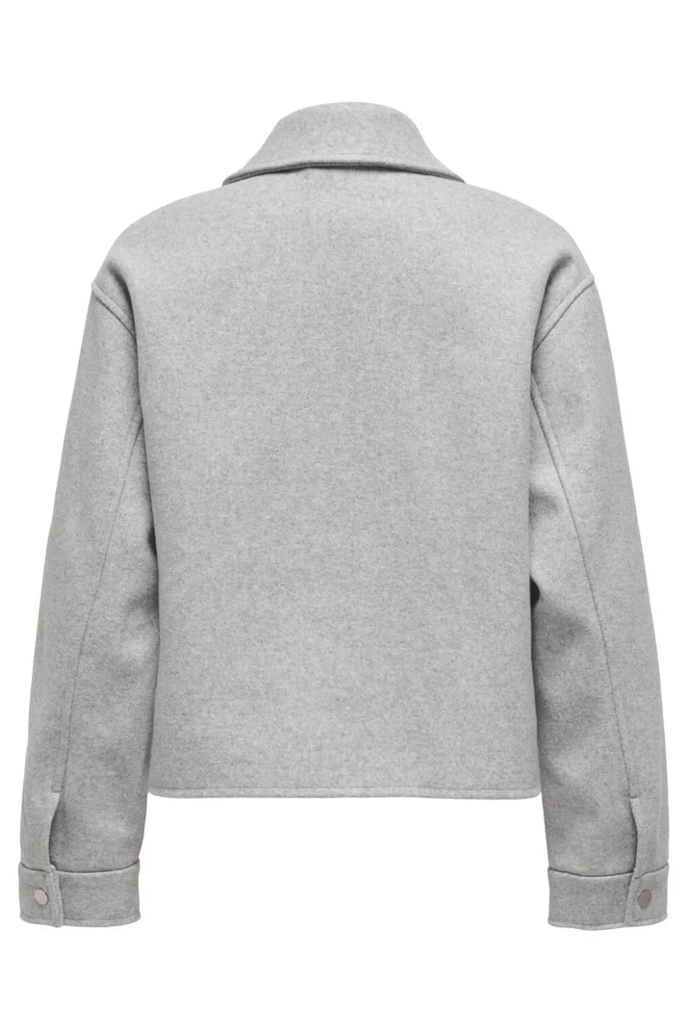 Lysegrå cargojakke fra Only med skjortekrave og lange ærmer. Jakken har en praktisk lynlåslukning foran og to rummelige sidelommer, der giver den et funktionelt præg.