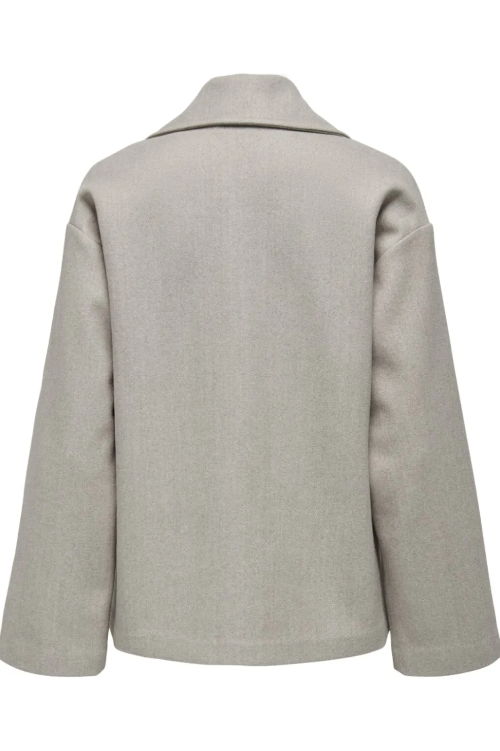 Jakke fra Only i beige-grå meleret nuance. Den har skjortekrave, dobbeltknapper og lange ærmer. Sidelommerne er placeret i en praktisk højde på jakken.