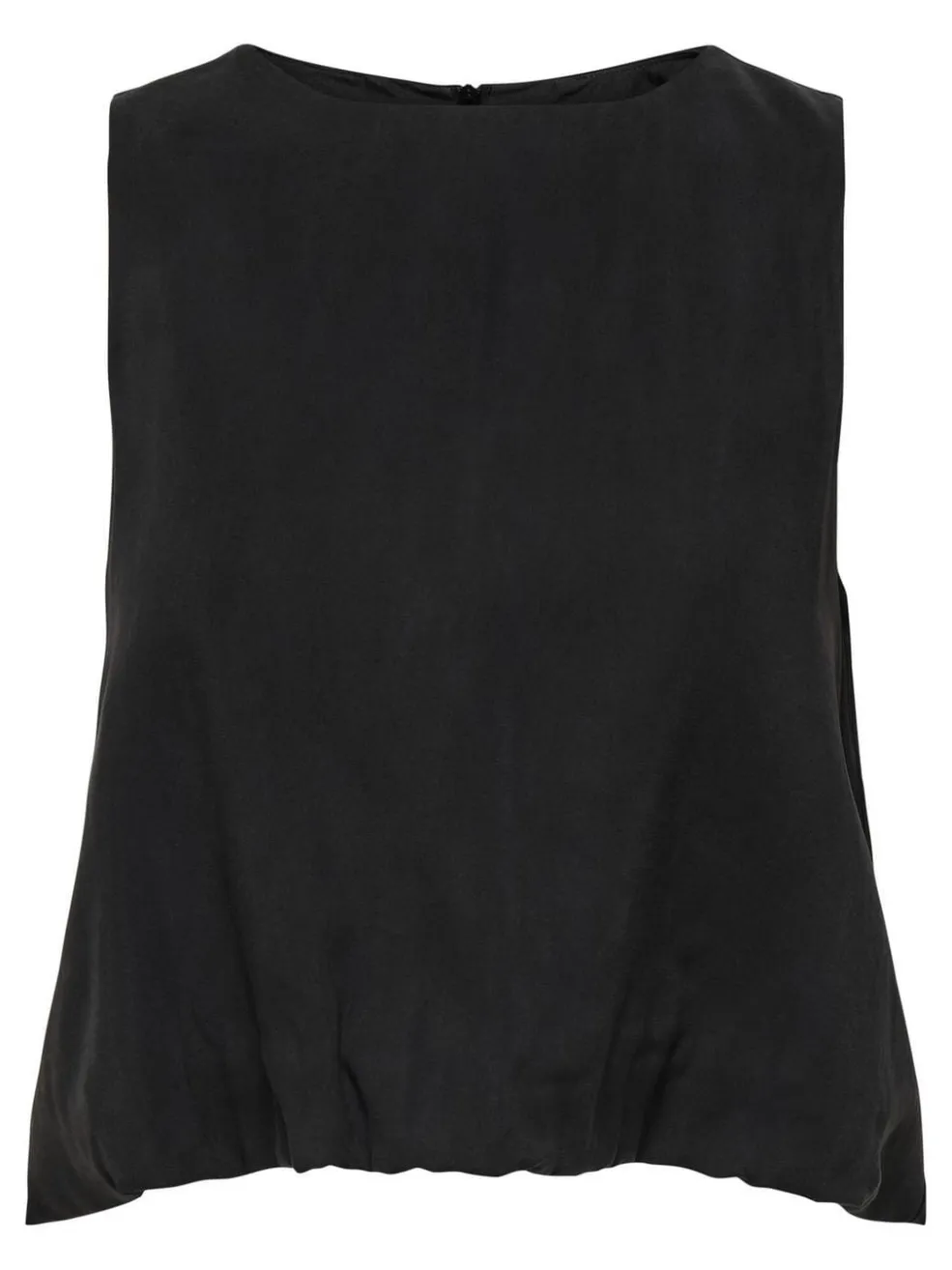 Sort ærmeløs top fra Only med rund halsudskæring. Toppen har en elastisk kant, der skaber en let bubble-effekt, og den lukkes med lynlås i ryggen.