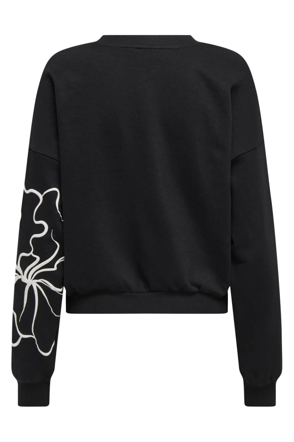 Sort sweatshirt fra Only med hvidt blomstermønster. Sweatshirten har en rund halsudskæring og lange ærmer. Den er lavet som en pullover uden lukning.