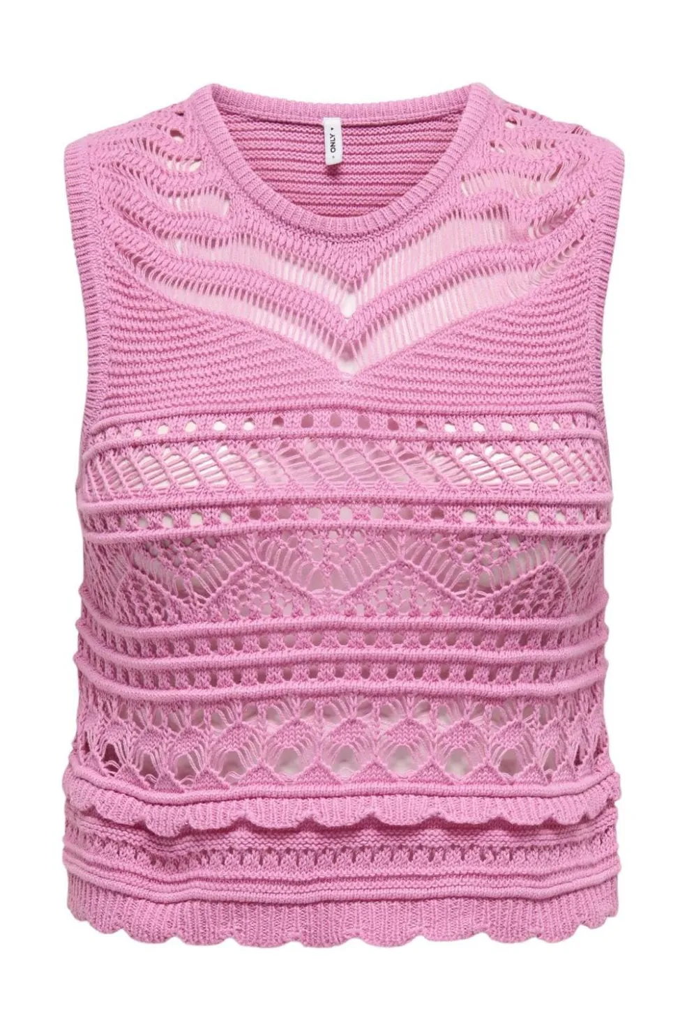 Strikket top fra Only i fuchsia pink. Det strikkede design har fine blondedetaljer og hulmønstre. Toppen er ærmeløs med rund halsudskæring og har en regular fit.