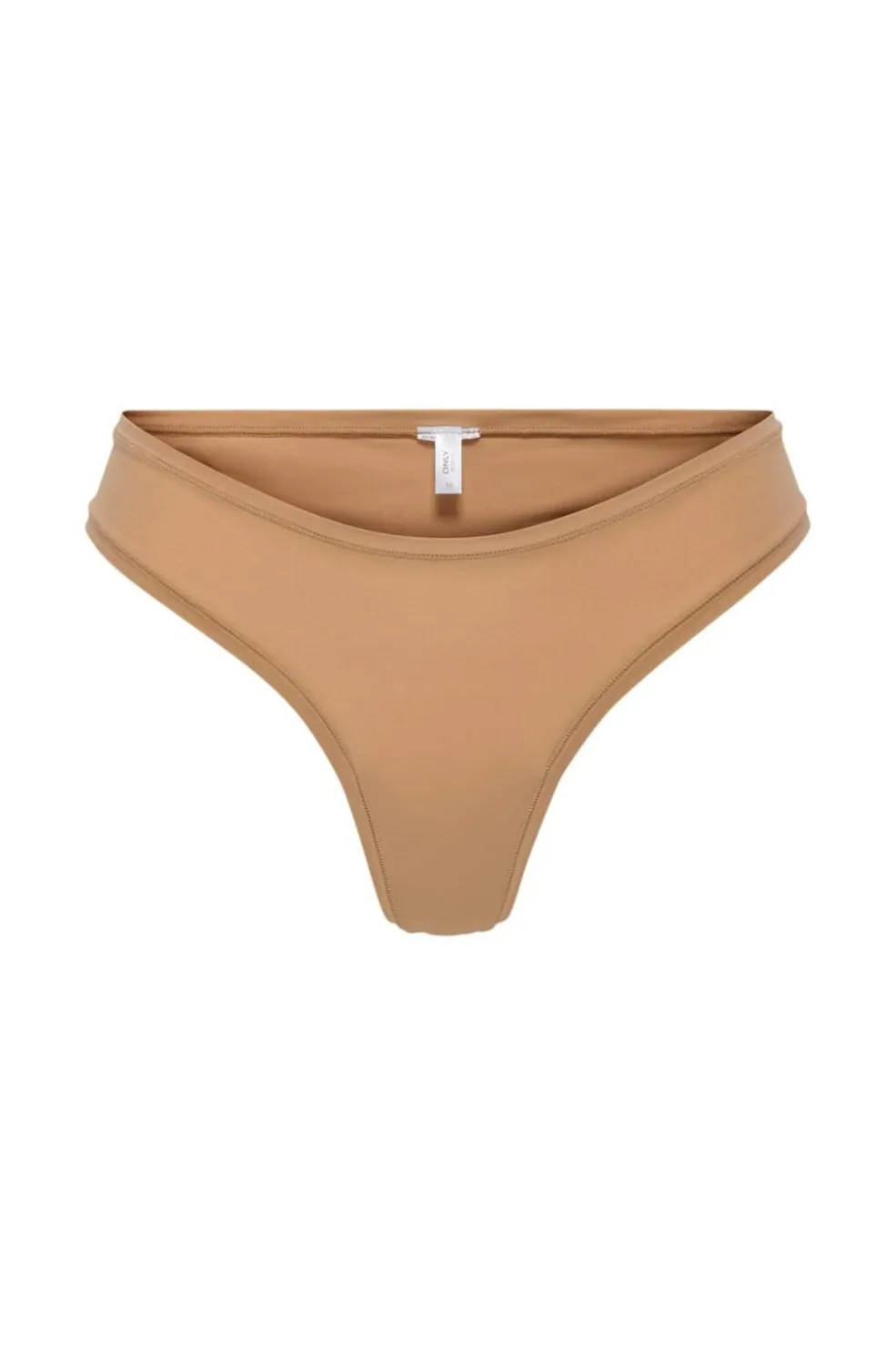 G-streng fra Only i den beige nuance Tawny Birch. Den har en lav talje og minimal bagdækning, der gør den usynlig under tøjet. Designet passer til både hverdag og fest.