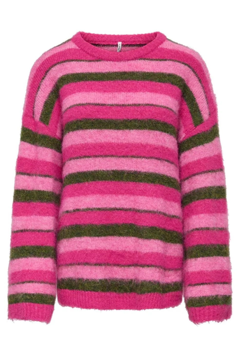 Stribet striktrøje fra Only med vandrette striber i pink og olivengrønne nuancer. Striktrøjen har en rund halsudskæring og lange ærmer med en regular fit-pasform.