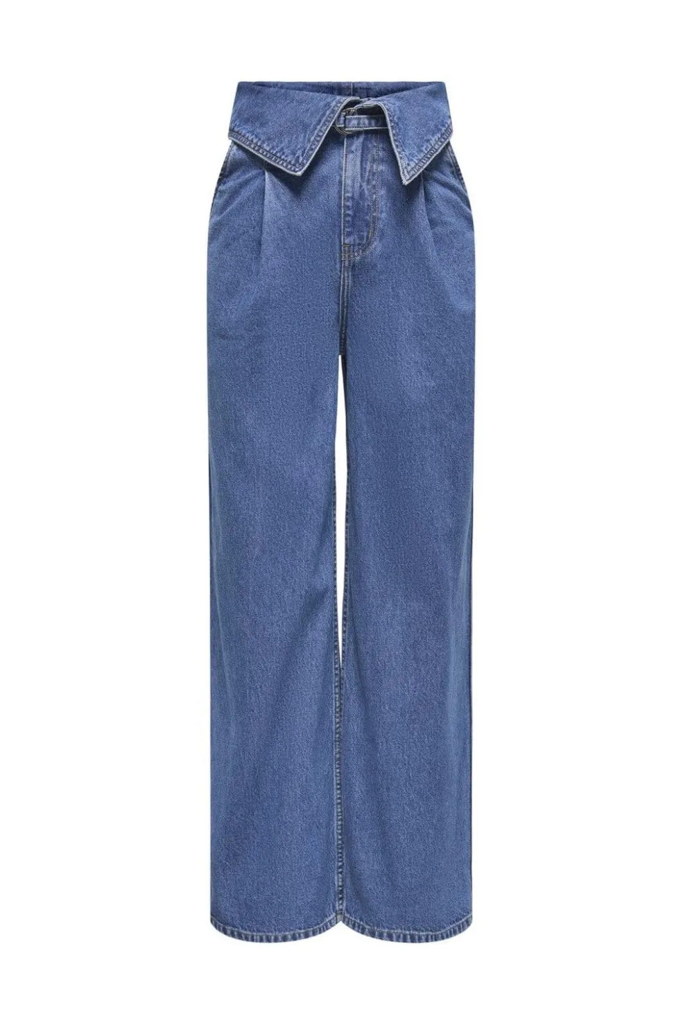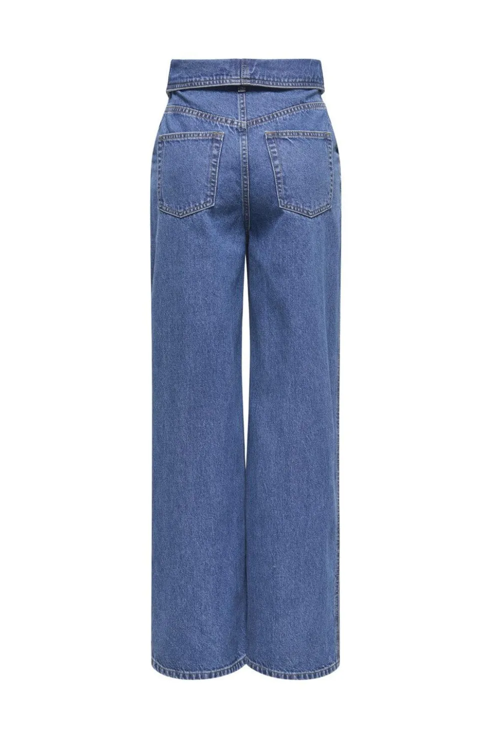 Vide jeans fra Only i mellemblå denim med et bredt bælte ved taljen. Bukserne har en løs pasform og vide ben fra hofte til ankel.