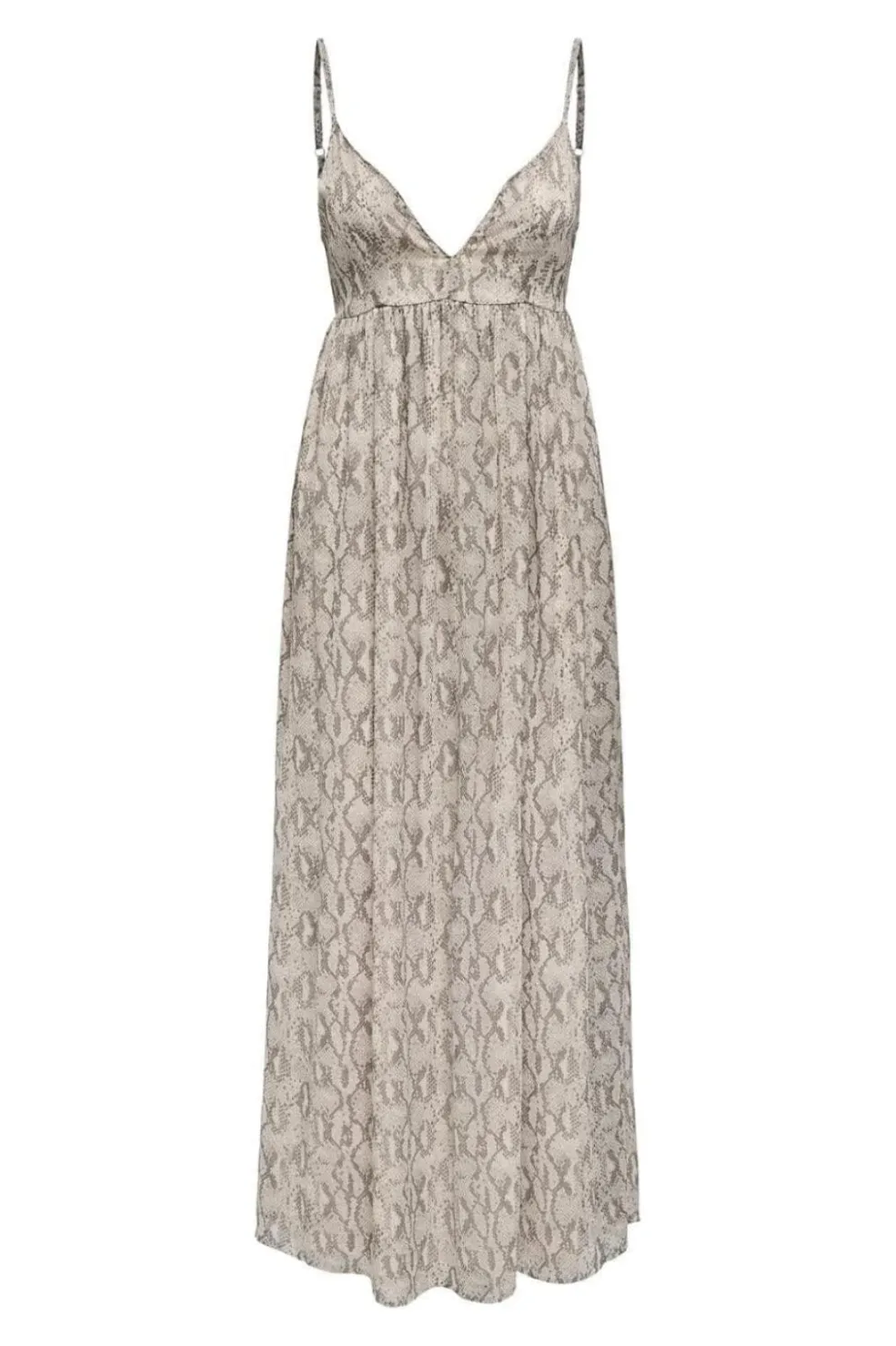 Maxikjole fra Only med slangeprint i beige nuancer. Kjolen har V-udskæring og tynde stropper med sløjfedetalje i ryggen.