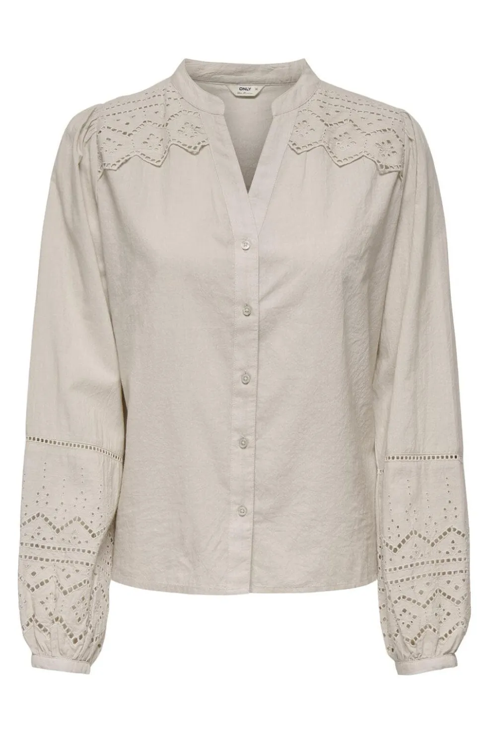Lys skjorte i bomuldsmateriale med båndkrave og knaplukning. Skjorten har lange ærmer med broderede detaljer på ærmerne og ved skuldrene.