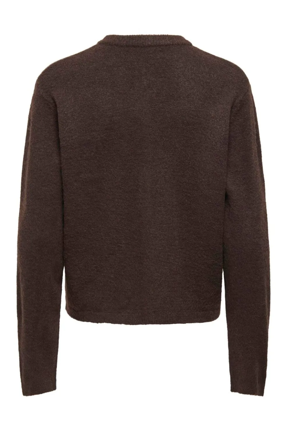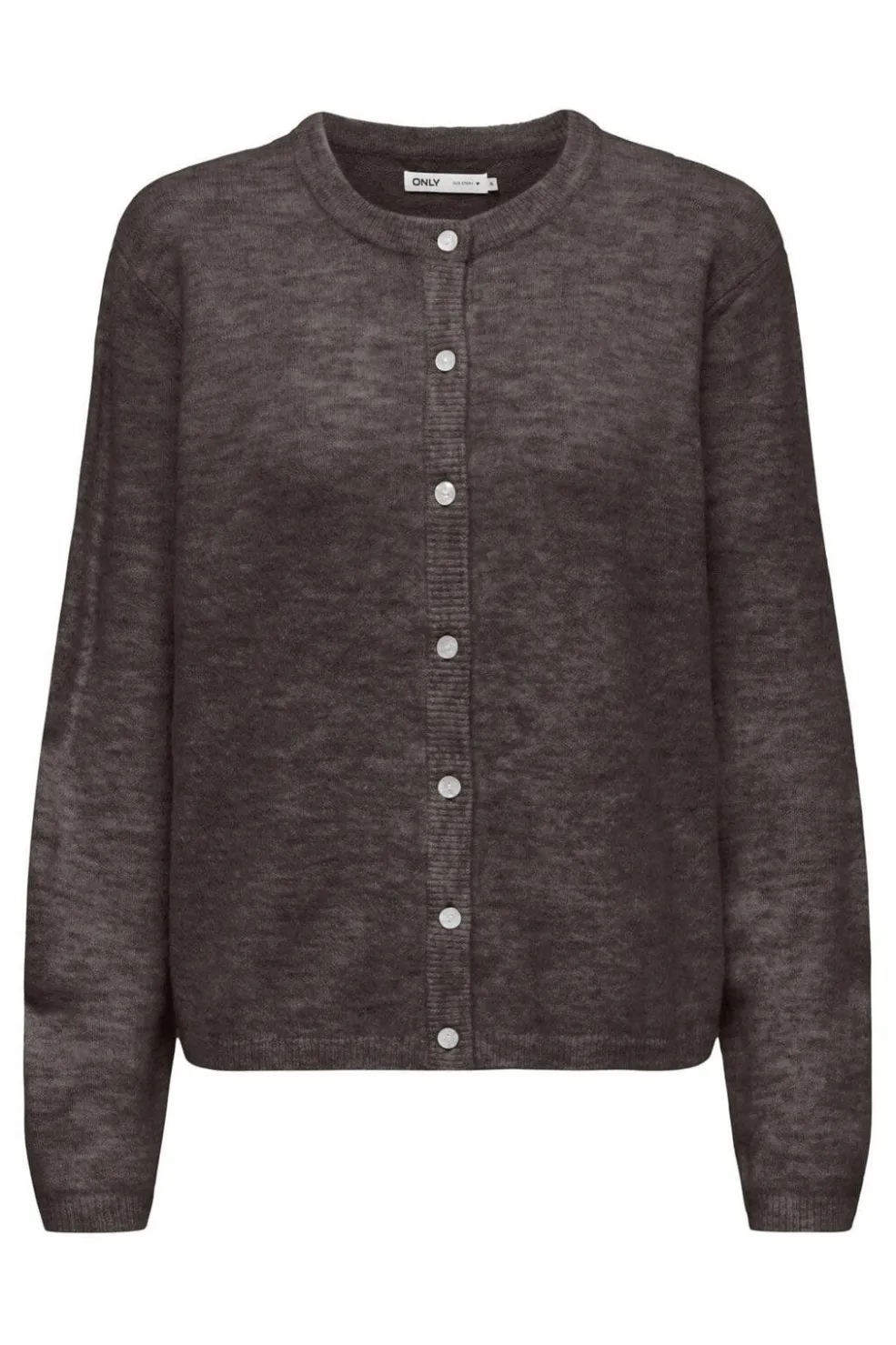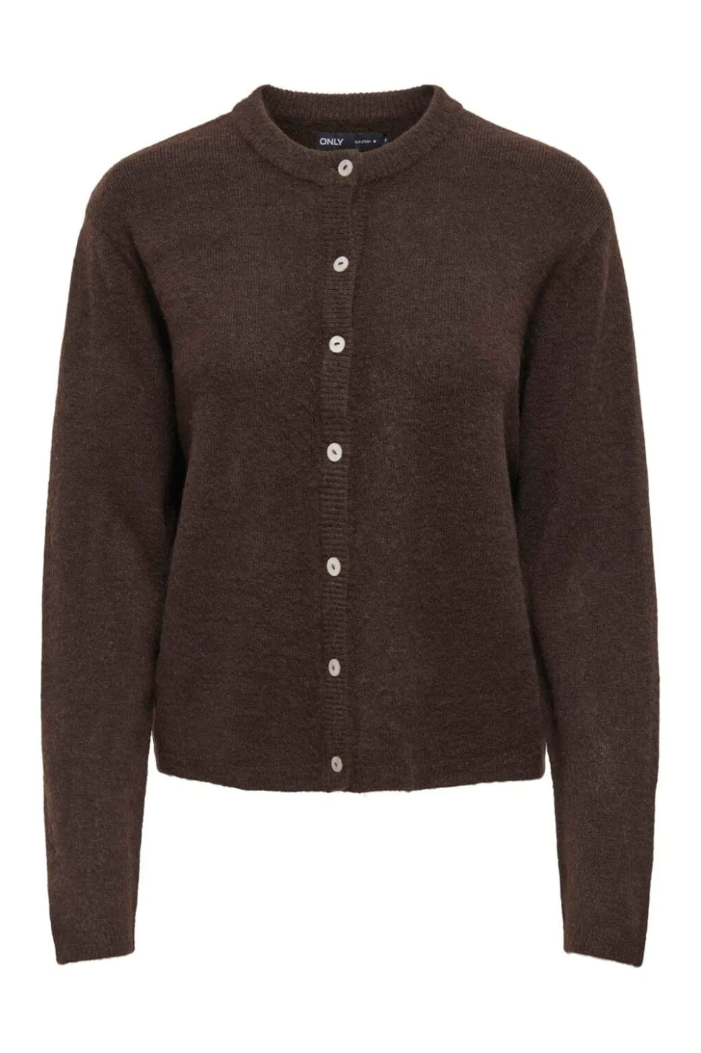 Brun cardigan fra Only med O-hals og knaplukning. Den løse pasform og de lange ærmer gør den velegnet til både hjemmebrug og afslappede hverdagssituationer.