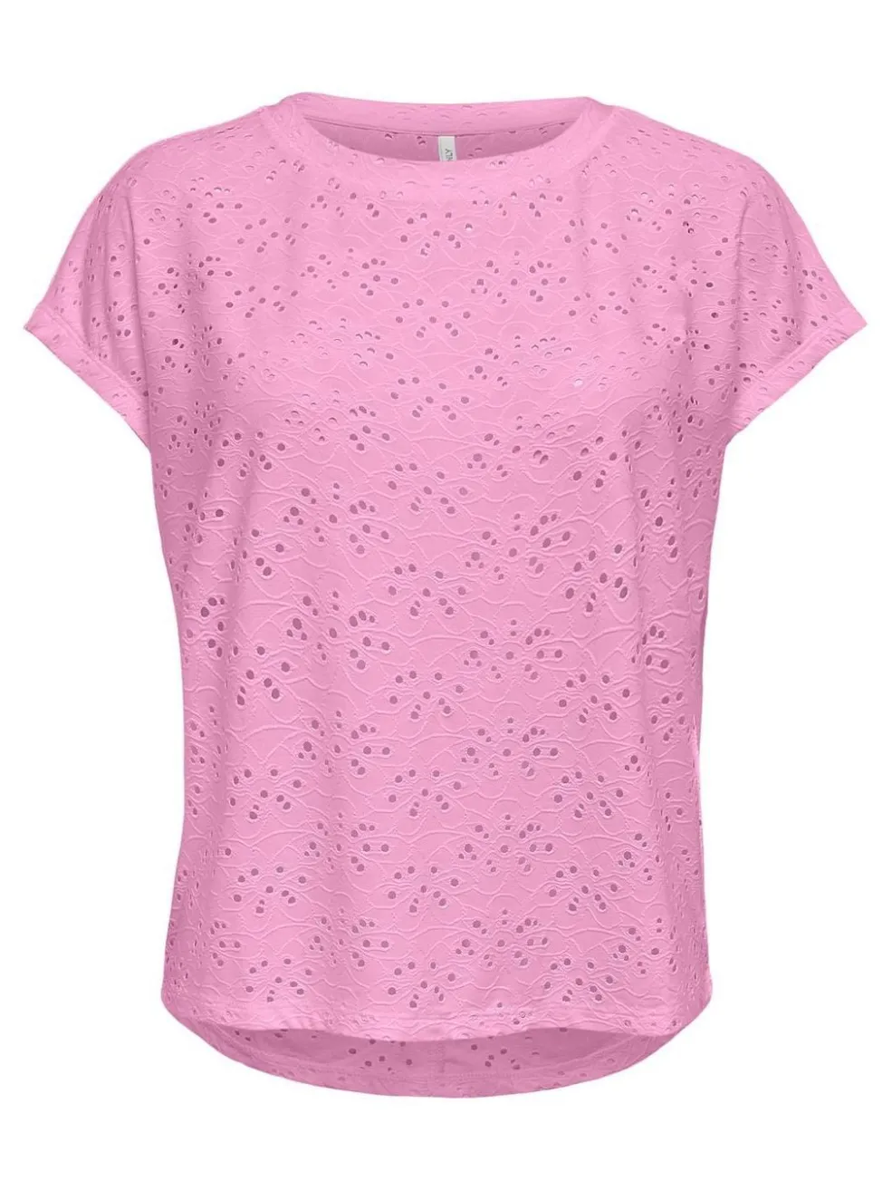 Lyserød top fra Only med blonder-detaljer. Toppen har et gennemgående mønster i stoffet, korte ærmer og en rund halsudskæring. Den er lavet i en lys bonbon-farve, der passer godt til forårssæsonen.