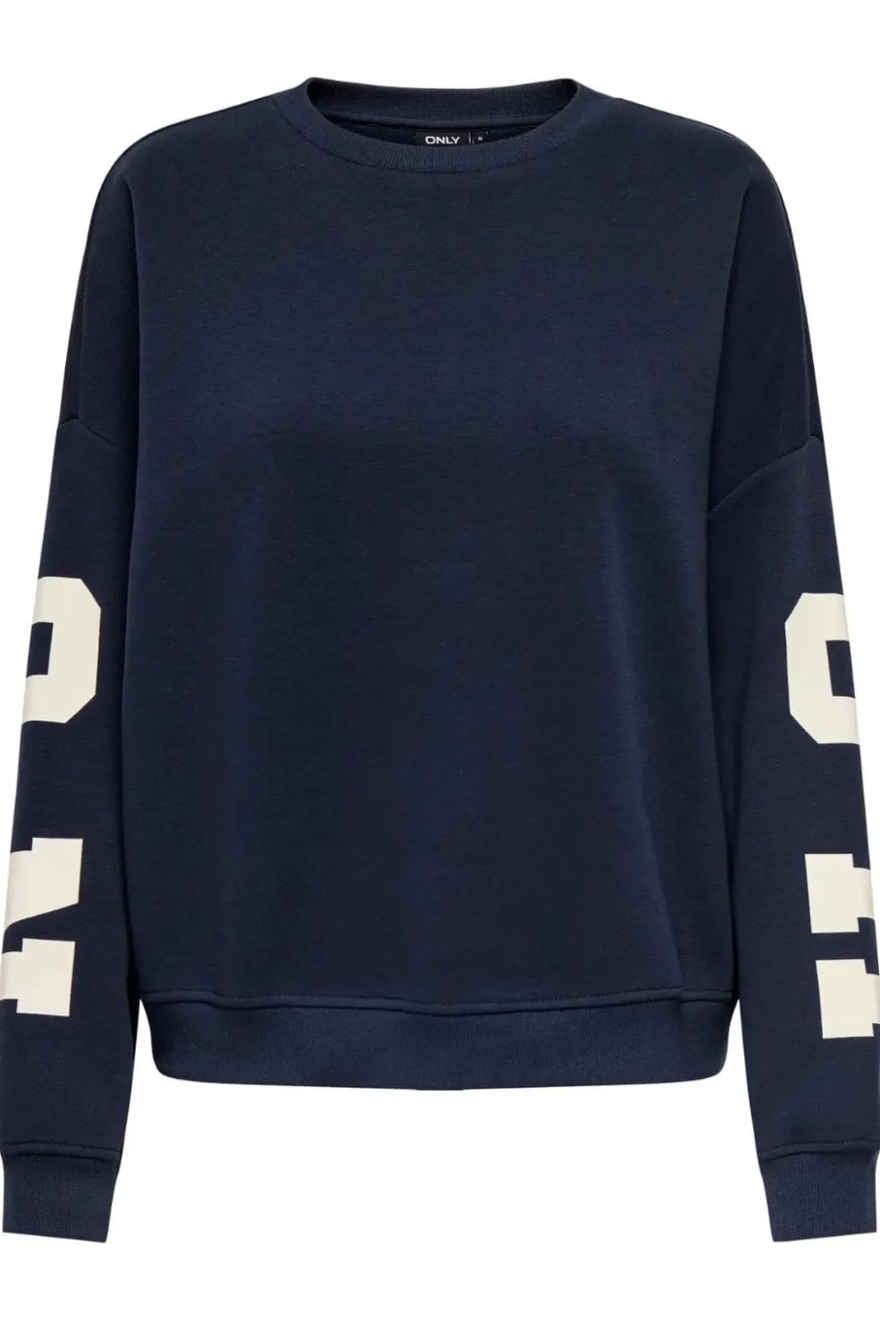Mørkeblå sweatshirt fra Only med print på ærmerne og ryggen. Sweatshirten har en løs pasform og rund hals.