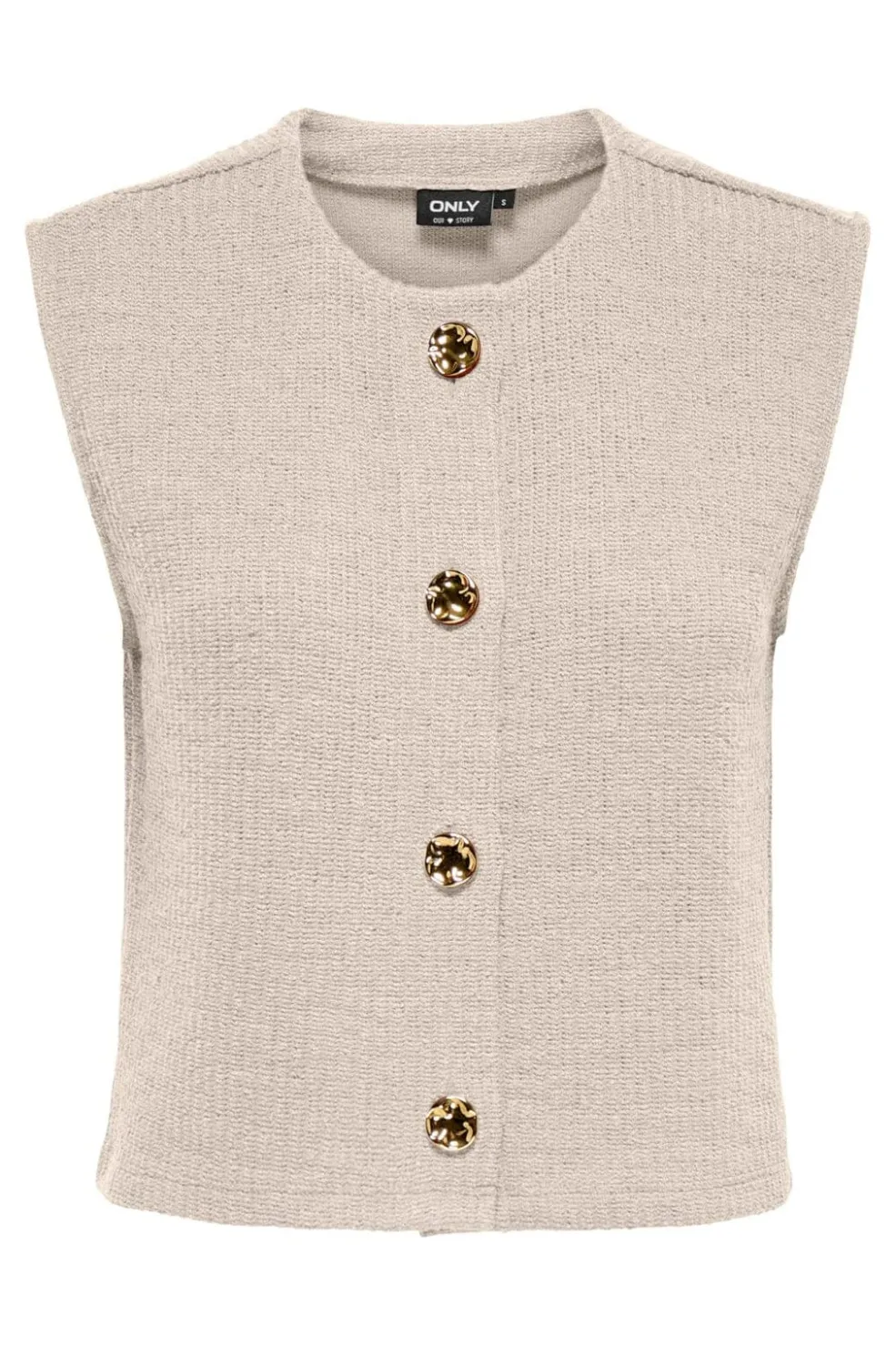 Ærmeløs vest fra Only i lys beige med fire guldknapper på forsiden. Vesten har en rund halsudskæring og er lavet af en materialeblanding.