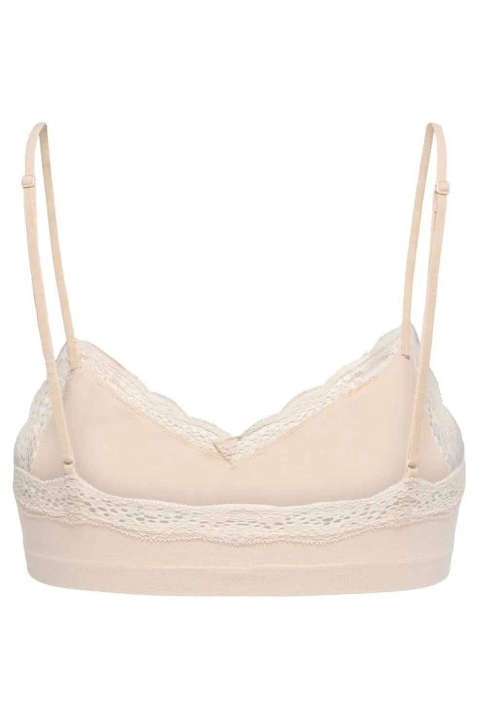 Bralette fra Only i ferskenfarvet stof med blondekanter. De tynde stropper kan justeres, og halsudskæringen har en blød v-form med blonder langs kanten.