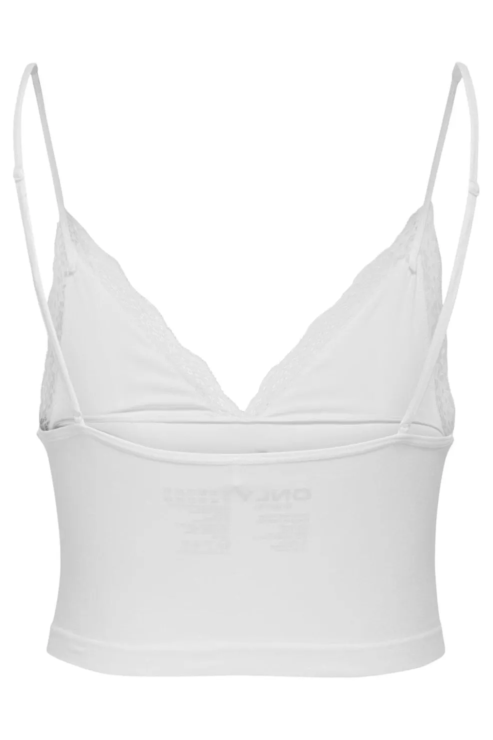 Hvid singlet fra Only med V-udskæring og blondedetaljer. De tynde stropper og den enkle pasform gør den til et praktisk basisstykke i garderoben.