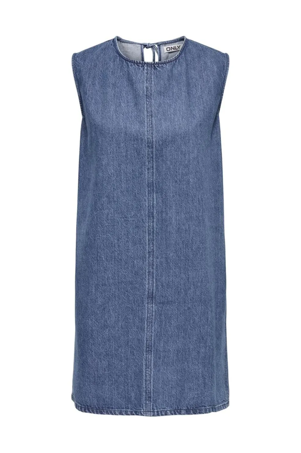 Ærmeløs denimkjole fra Only i medium blå denim. Kjolen har en rund halsudskæring og bindedetaljer på ryggen, der giver den et enkelt og rent udtryk.