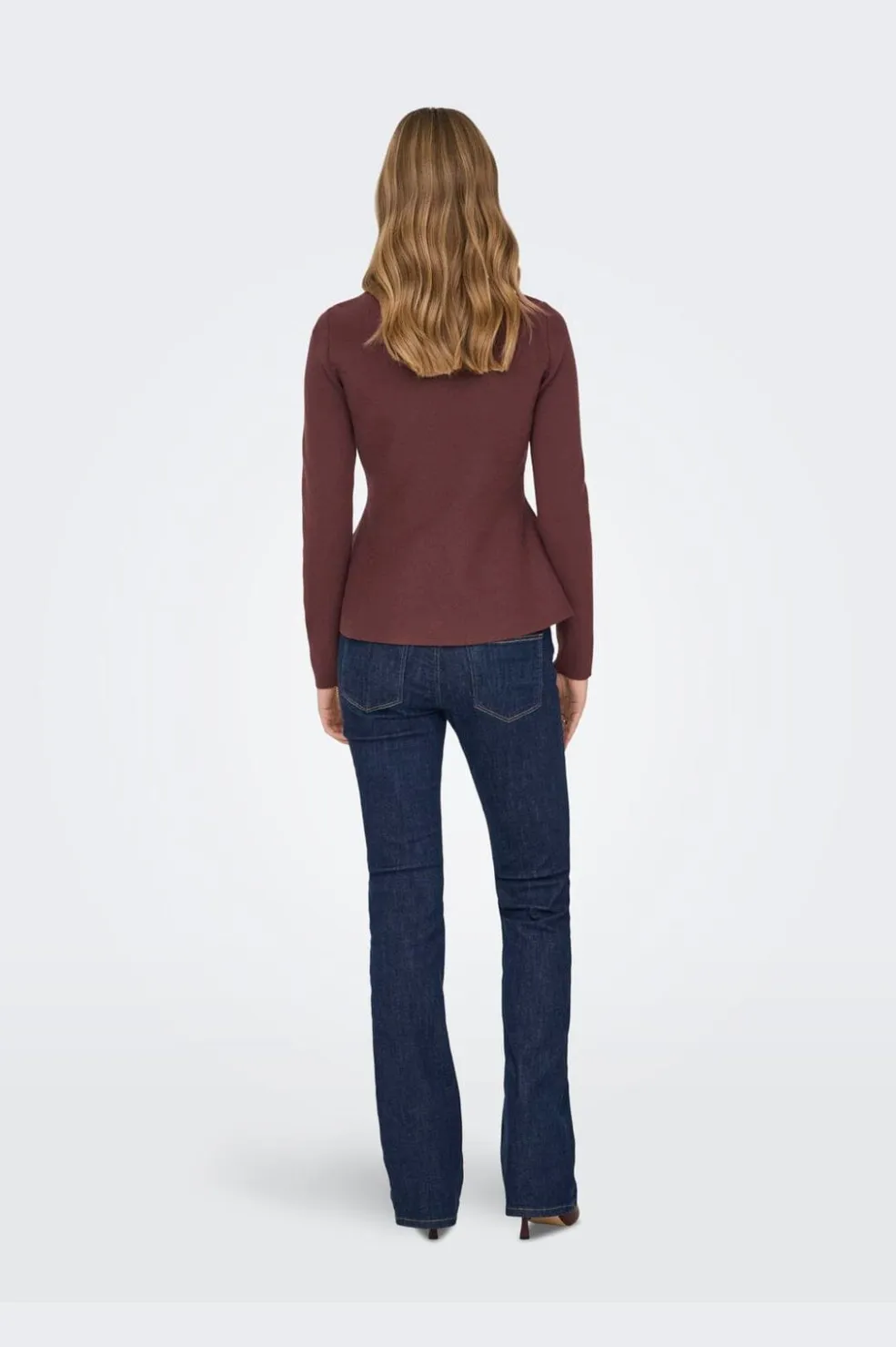 Brunrød striktrøje fra ONLY med peplumdetalje. Toppen har en rund halsudskæring og lange ærmer i en regular fit-pasform.