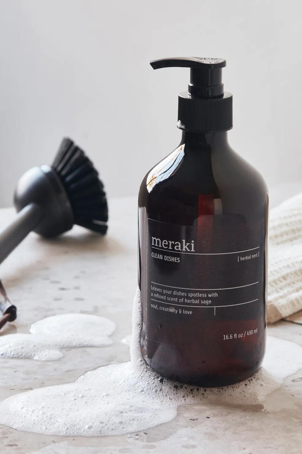 Dette opvaskemiddel fra Meraki hedder Herbal Nest og er Svanemærket. Du behøver kun ganske lidt, og med pumpedesignet er det nemt at få den rette dosering ud. Nyd den bløde skum og den lette duft med noter af salvie, citrus og musk. Design og funktionalitet smelter sammen i denne flaske, som du nemt kan have stående som dekoration ved køkkenvasken. Brug 2 ml sæbe til 5 liter vand. Opvaskemidlet må ikke bruges i opvaskemaskinen.
