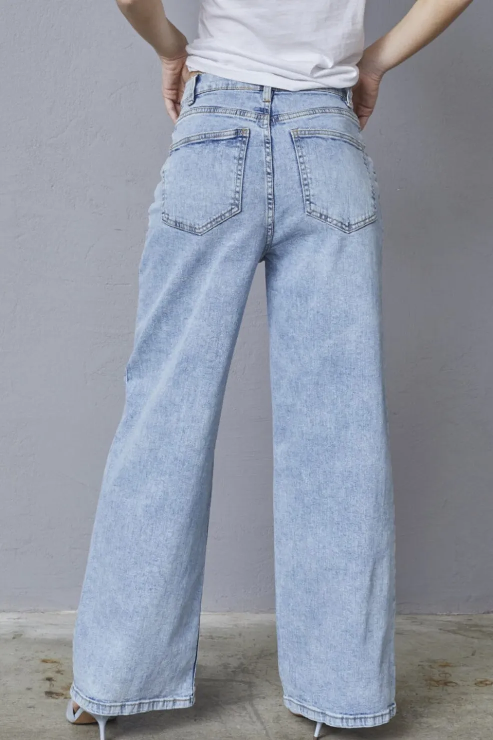 Lyseblå jeans fra Sisters Point med brede ben og høj talje. Bukserne har en løs pasform og er lavet i et behageligt denim-materiale med en lys blåvask.