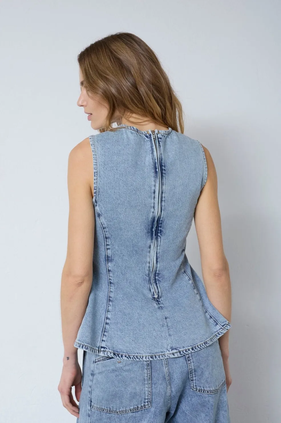 Denimtop fra Co´Couture i falmet blå bomuld. Toppen har en peplum-stil med tætsiddende overdel og udvidet nederdel, rund halsudskæring og ærmeløst design.