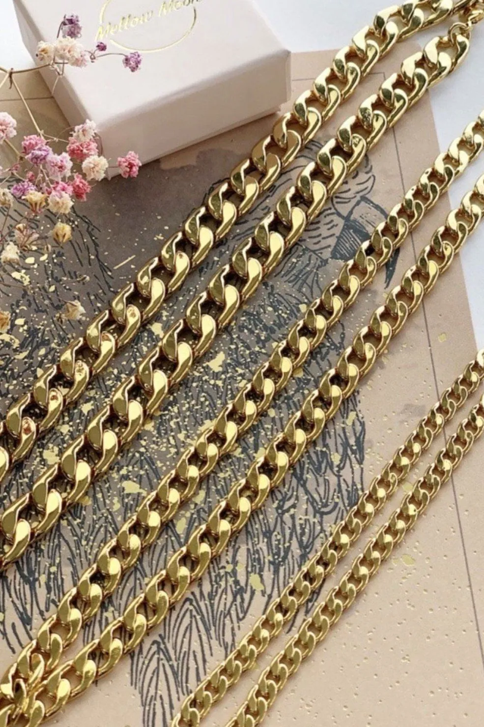 Størrelser: Kæden kan købes i tykkelsen 3,5 mm og 5,5 mm. Længden på kæden er 45 cm.