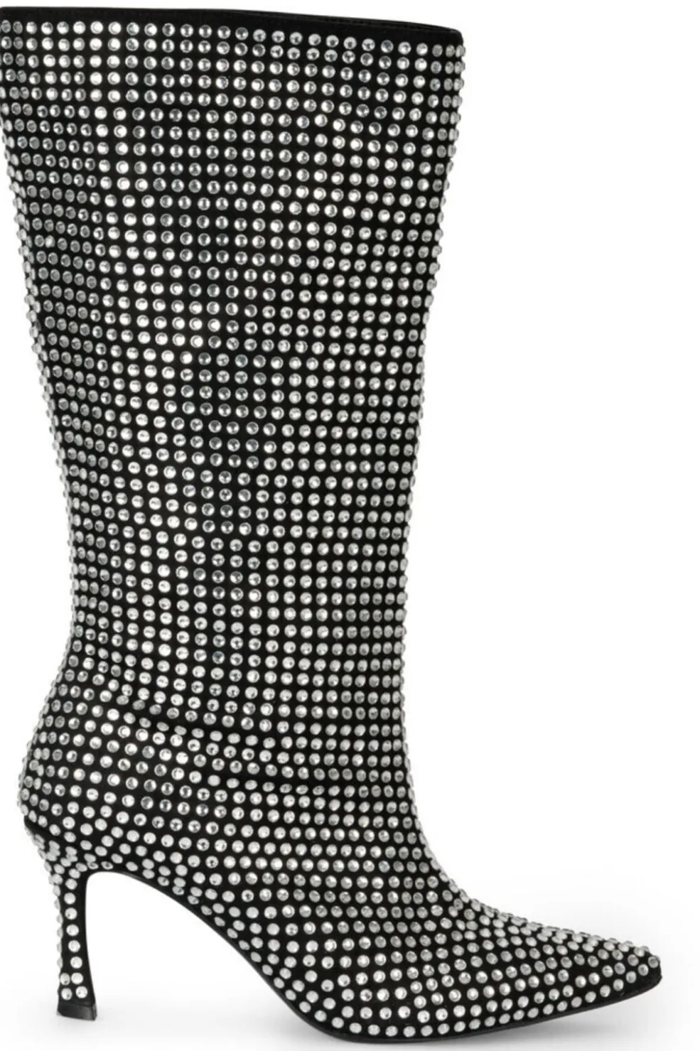 Knæhøje støvler fra Cras med sølvfarvede pailletter på hele overfladen. Støvlerne har en spids tå og en slank stilettohæl, der giver en flot silhuet.