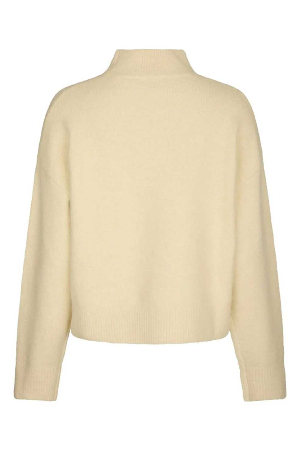 Buttergul strikbluse fra Neo Noir med en høj hals og lange ærmer. Blusen har en løs pasform og er lavet af en blanding af polyester, akryl, uld og elastan.