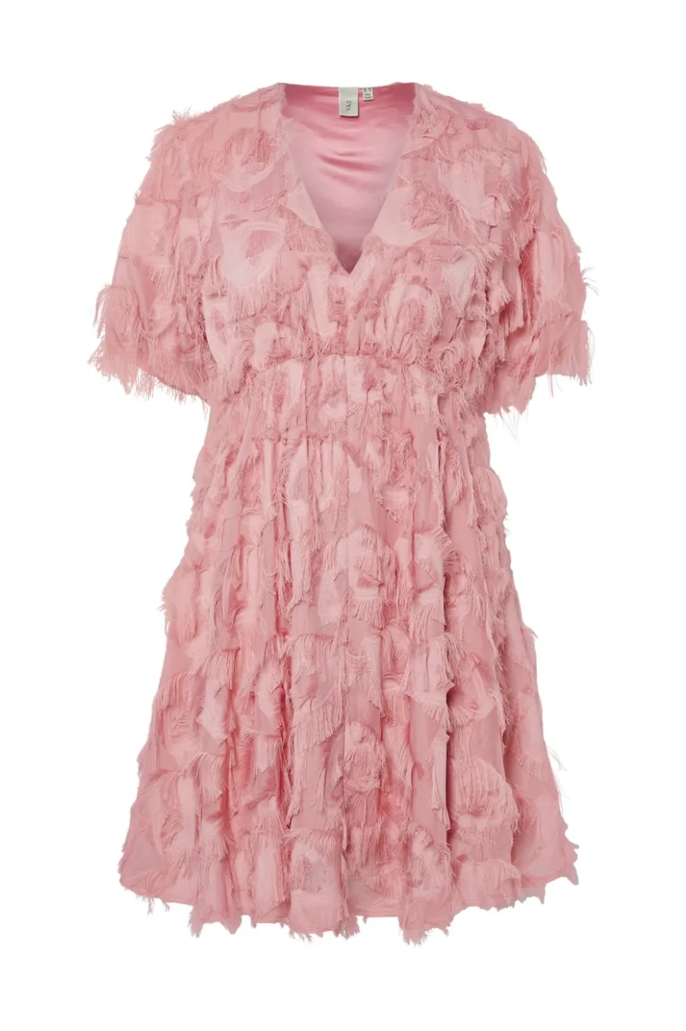 Festkjole fra Y. A.S i pink med frynser. Kjolen har en løs pasform med samlet talje og 3/4-ærmer. V-udskæringen og de teksturerede detaljer skaber en let og luftig silhuet.